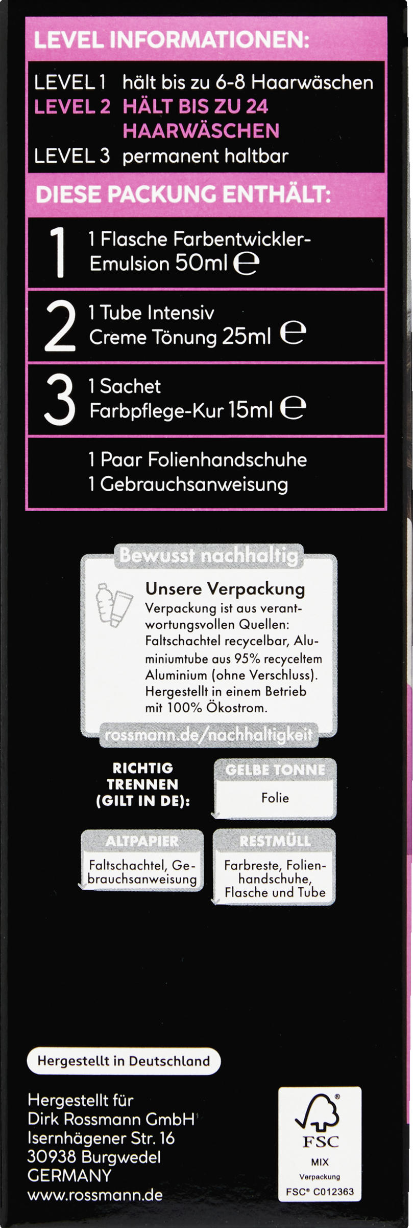 - Inhalt: 1 Flasche Farbentwickler-Emulsion (50 ml), 1 Paar Folienhandschuhe, 1 Gebrauchsanweisung, 1 Tube Intensiv Creme Tönung (25 ml), 1 Sachet Farbpflege-Kur (15 ml)