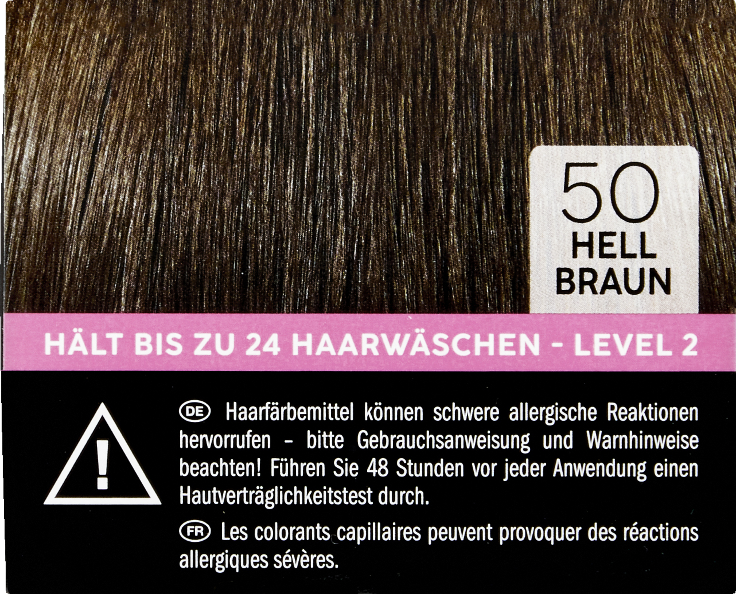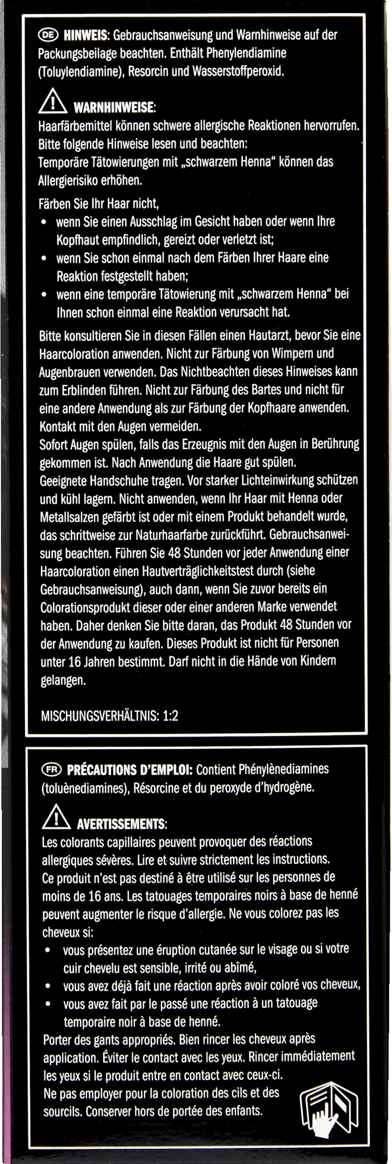 Gebrauchsanweisung und Warnhinweise auf der Packungsbeilage beachten. Enthält Phenylendiamine (Toluylendiamine), Resorcin und Wasserstoffperoxid. Haarfärbemittel können schwere allergische Reaktionen hervorrufen. Bitte folgende Hinweise lesen und beachten: