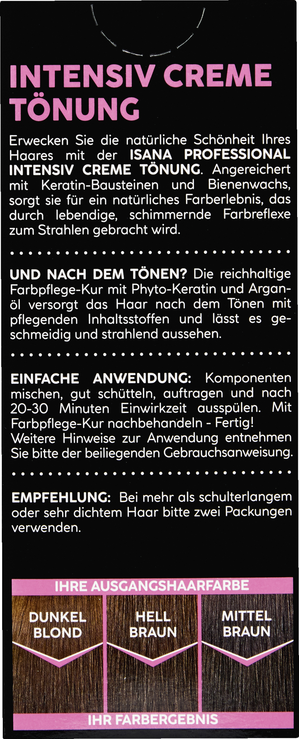 Erwecken Sie die natürliche Schönheit Ihres Haares mit der ISANA Professional Intensiv Creme Tönung. Angereichert mit Keratin-Bausteinen und Bienenwachs, sorgt sie für ein natürliches Farbergebnis, das durch lebendige, schimmernde Farbreflexe zum Strahlen gebracht wird.