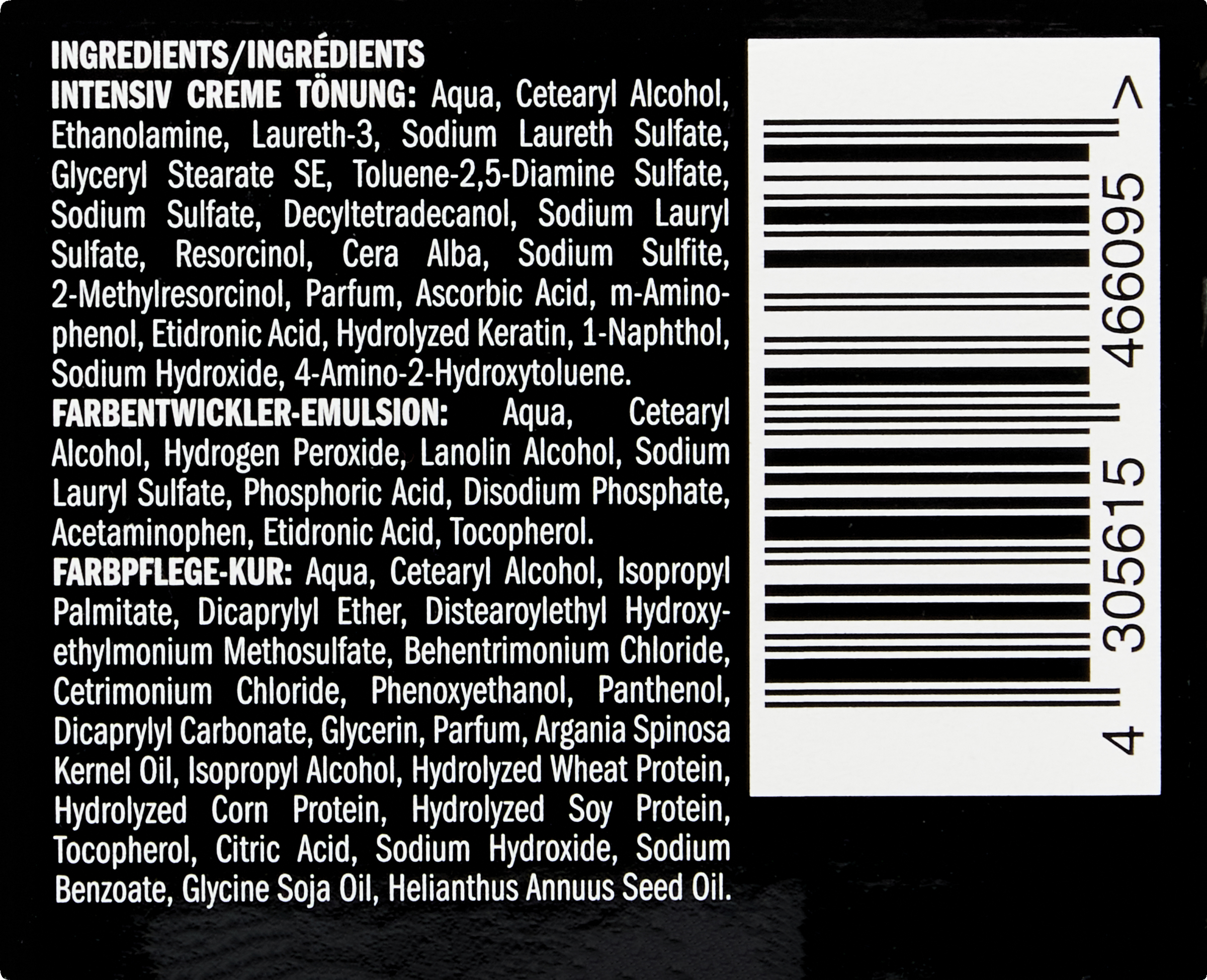 - Intensiv Creme Tönung: Aqua, Cetearyl Alcohol, Ethanolamine, Laureth-3, Sodium Laureth Sulfate, Glyceryl Stearate SE, Toluene-2,5-Diamine Sulfate, Sodium Sulfate, Decyltetradecanol, Sodium Lauryl Sulfate, Resorcinol, Cera Alba, Sodium Sulfite, Parfum, 2-Methylresorcinol, Ascorbic Acid, m-Aminophenol, Etidronic Acid, Hydrolyzed Keratin, 1-Naphthol, Sodium Hydroxide, 4-Amino-2-Hydroxytoluene.