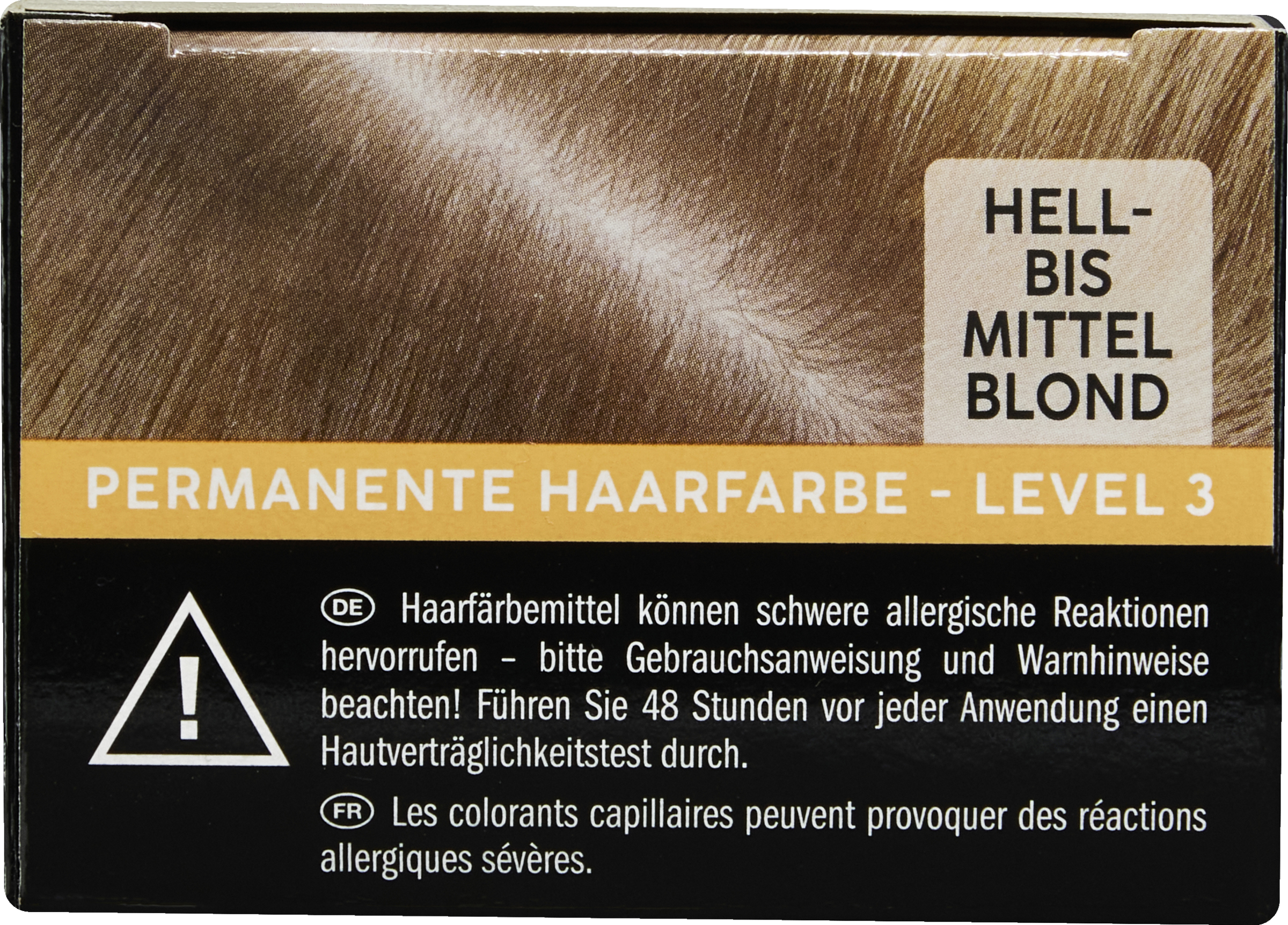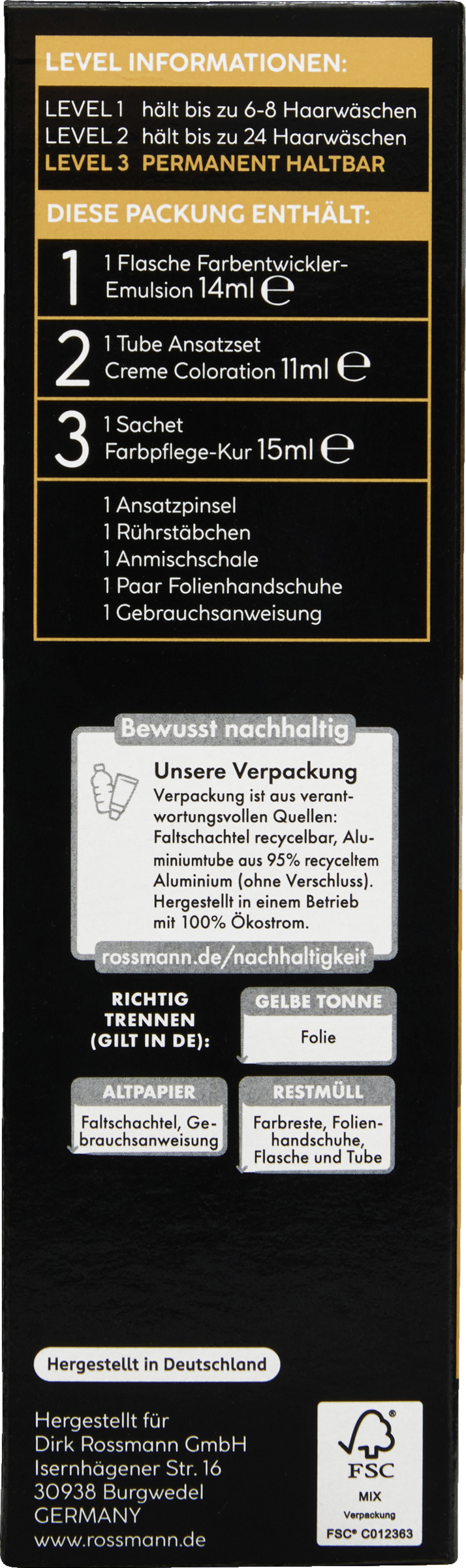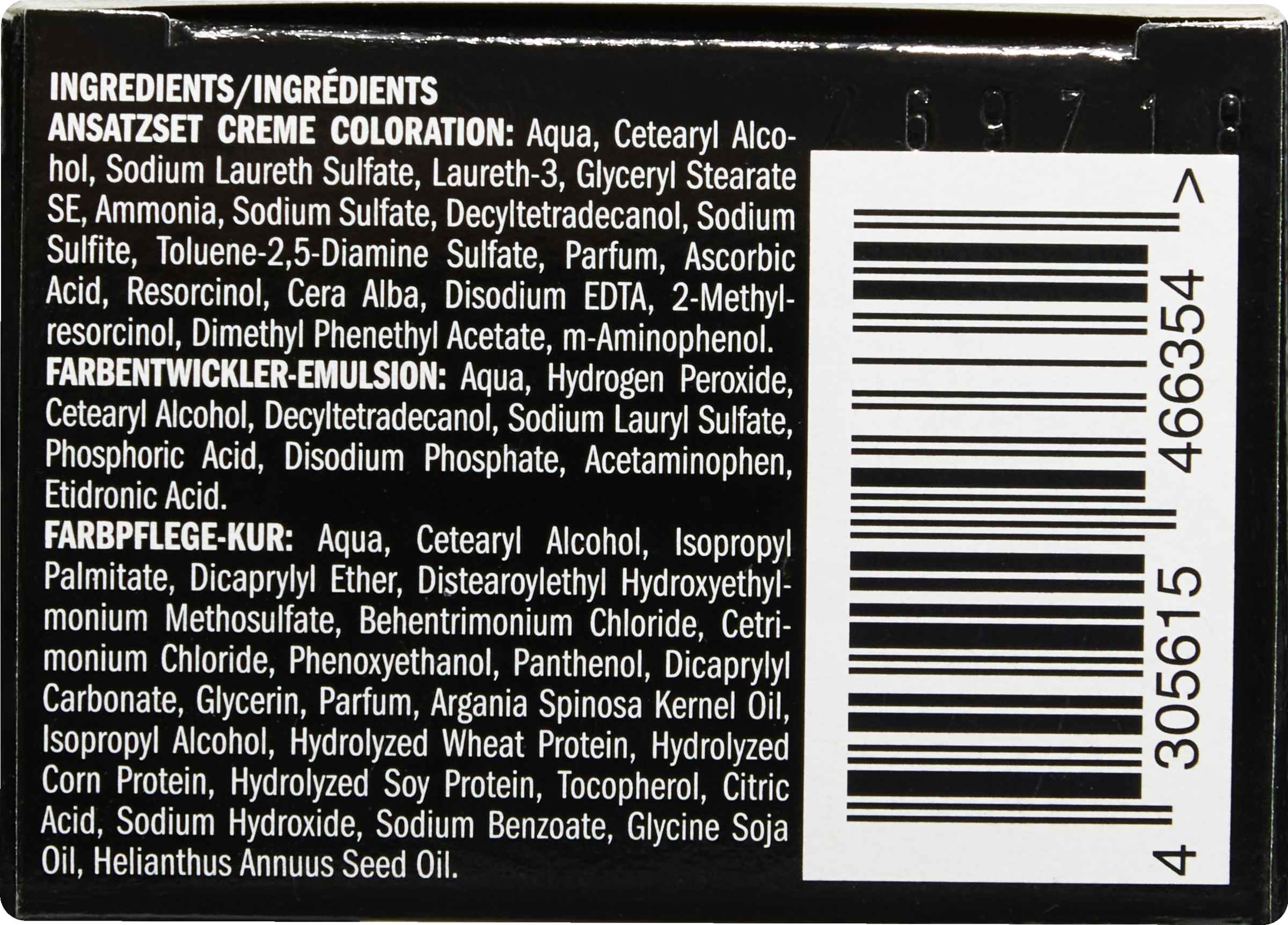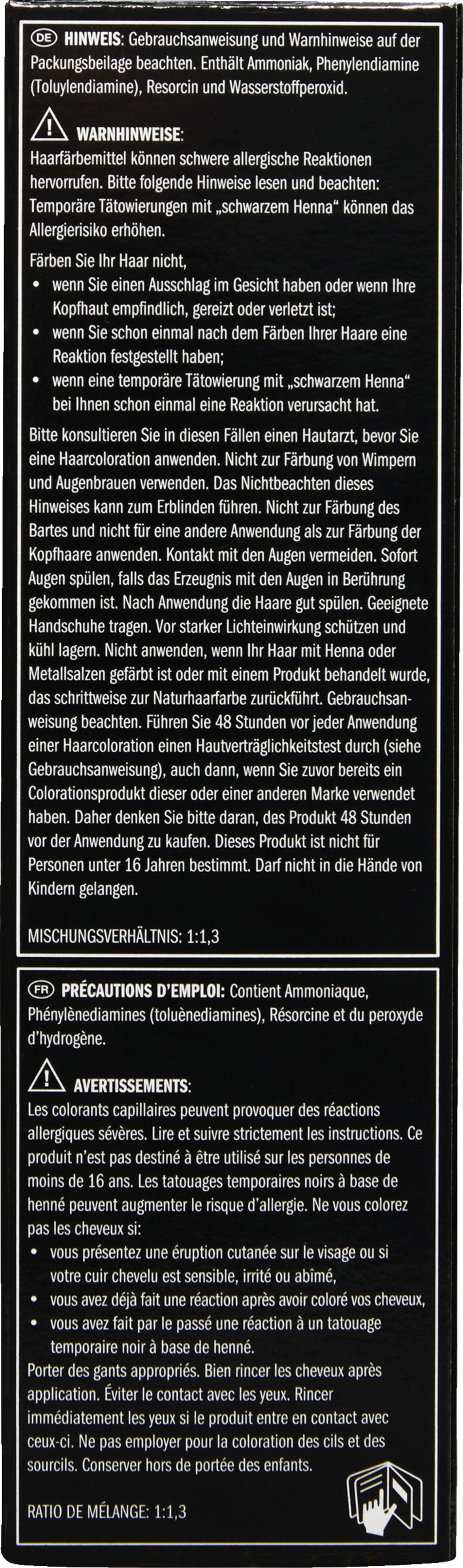 Enthält Ammoniak, Phenylendiamine (Toluylendiamine), Resorcin und Wasserstoffperoxid. Haarfärbemittel können schwere allergische Reaktionen hervorrufen. Bitte folgende Hinweise lesen und beachten: Temporäre Tätowierungen mit „schwarzem Henna“ können das Allergierisiko erhöhen. Färben Sie Ihr Haar nicht, wenn Sie einen Ausschlag im Gesicht haben oder wenn Ihre Kopfhaut empfindlich, gereizt oder verletzt ist; wenn Sie schon einmal nach dem Färben Ihrer Haare eine Reaktion festgestellt haben; wenn eine temporäre Tätowierung mit „schwarzem Henna“ bei Ihnen schon einmal eine Reaktion verursacht hat. Bitte konsultieren Sie in diesen Fällen einen Hautarzt, bevor Sie eine Haarcoloration anwenden. Nicht zur Färbung von Wimpern und Augenbrauen verwenden. Das Nichtbeachten dieses Hinweises kann zum Erblinden führen. Nicht zur Färbung des Bartes und nicht für eine andere Anwendung als zur Färbung der Kopfhaare anwenden. Kontakt mit den Augen vermeiden. Sofort Augen spülen, falls das Erzeugnis mit den Augen in Berührung gekommen ist. Nach Anwendung die Haare gut spülen. Geeignete Handschuhe tragen. Nicht anwenden, wenn Ihr Haar mit Henna oder Metallsalzen gefärbt ist oder mit einem Produkt behandelt wurde, das schrittweise zur Naturhaarfarbe zurückführt. Gebrauchsanweisung beachten. Führen Sie 48 Stunden vor jeder Anwendung einer Haarcoloration einen Hautverträglichkeitstest durch (siehe Gebrauchsanweisung), auch dann, wenn Sie zuvor bereits ein Colorationsprodukt dieser oder einer anderen Marke verwendet haben. Daher denken Sie bitte daran, das Produkt 48 Stunden vor der Anwendung zu kaufen. Dieses Produkt ist nicht für Personen unter 16 Jahren bestimmt. Darf nicht in die Hände von Kindern gelangen.