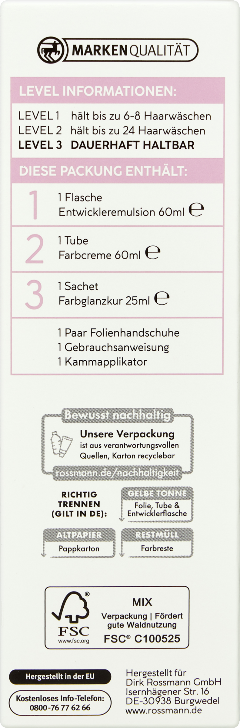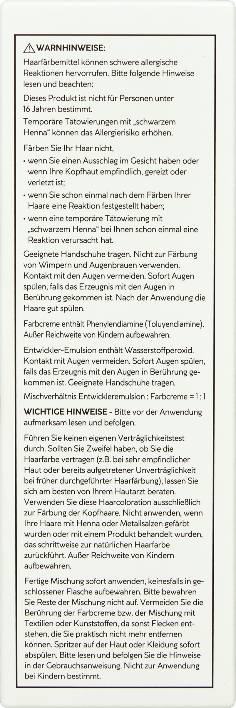 Führen Sie keinen eigenen Verträglichkeitstest durch. Sollten Sie Zweifel haben, ob Sie die Haarfarbe vertragen (z.B. bei sehr empfindlicher Haut oder bereits aufgetretener Unverträglichkeit bei früher durchgeführter Haarfärbung), lassen Sie sich am besten von Ihrem Hautarzt beraten. Verwenden Sie diese Haarcoloration ausschließlich zur Färbung der Kopfhaare. Nicht anwenden, wenn Ihre Haare mit Henna oder Metallsalzen gefärbt wurden oder mit einem Produkt behandelt wurden, das schrittweise zur natürlichen Haarfarbe zurückführt. Außer Reichweite von Kindern aufbewahren.