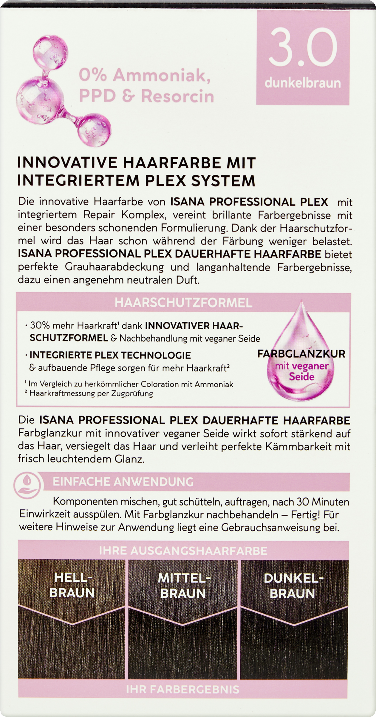 ISANA PROFESSIONAL PLEX DAUERHAFTE HAARFARBE bietet perfekte Grauhaarabdeckung und langanhaltende Farbergebnisse, dazu einen angenehm neutralen Duft. Die ISANA PROFESSIONAL PLEX DAUERHAFTE HAARFARBE Farbglanzkur mit innovativer veganer Seide wirkt sofort stärkend auf das Haar, versiegelt das Haar und verleiht perfekte Kämmbarkeit mit frisch leuchtendem Glanz.
