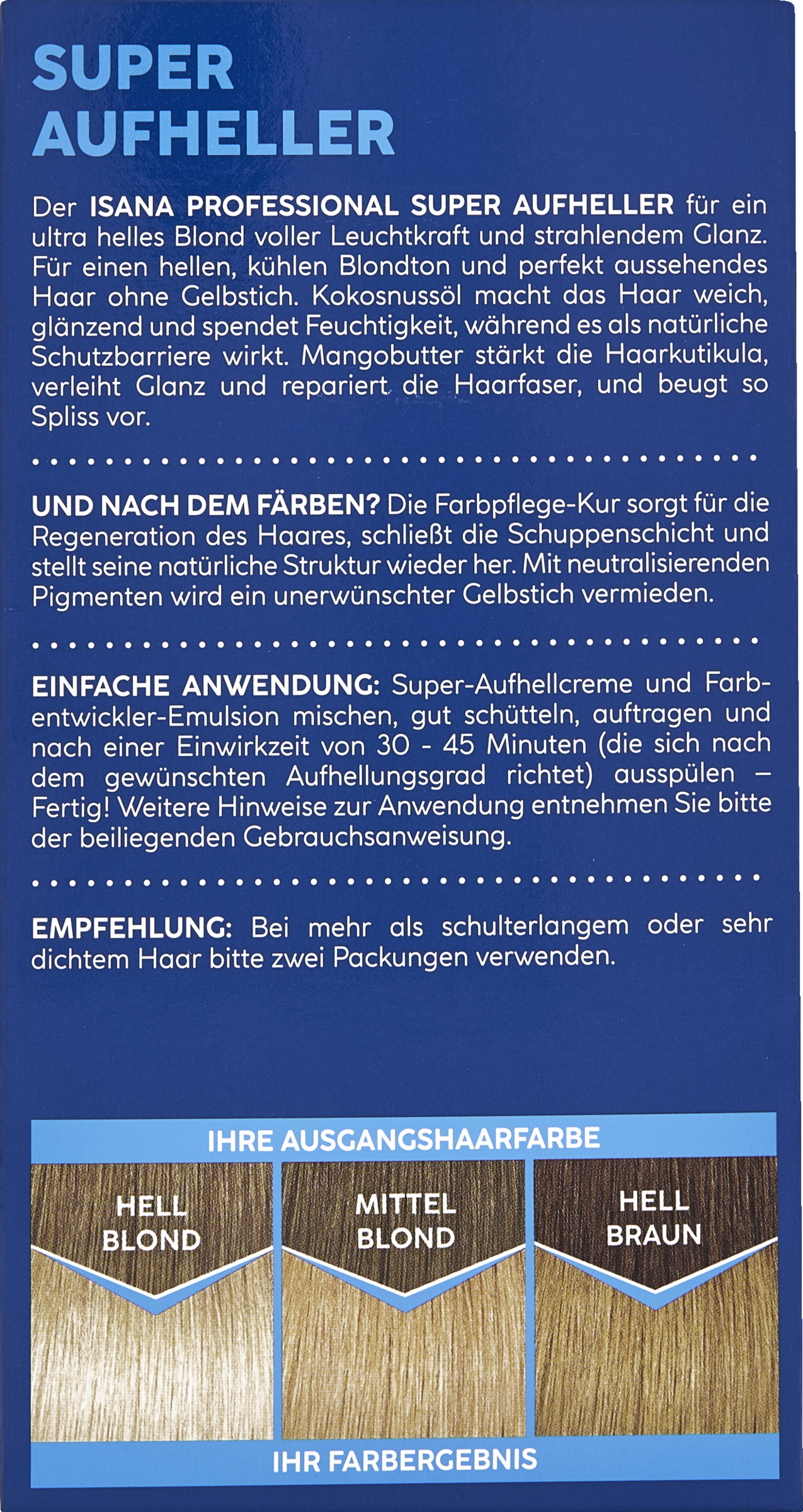 Der Super Aufheller für ein ultra helles Blond voller Leuchtkraft und strahlendem Glanz. Die hochwertige Farbpflege-Kur mit neutralisierenden Pigmenten pflegt das Haar und lässt es strahlen. Für einen hellen, kühlen Blondton und perfekt aussehendes Haar ohne Gelbstich.