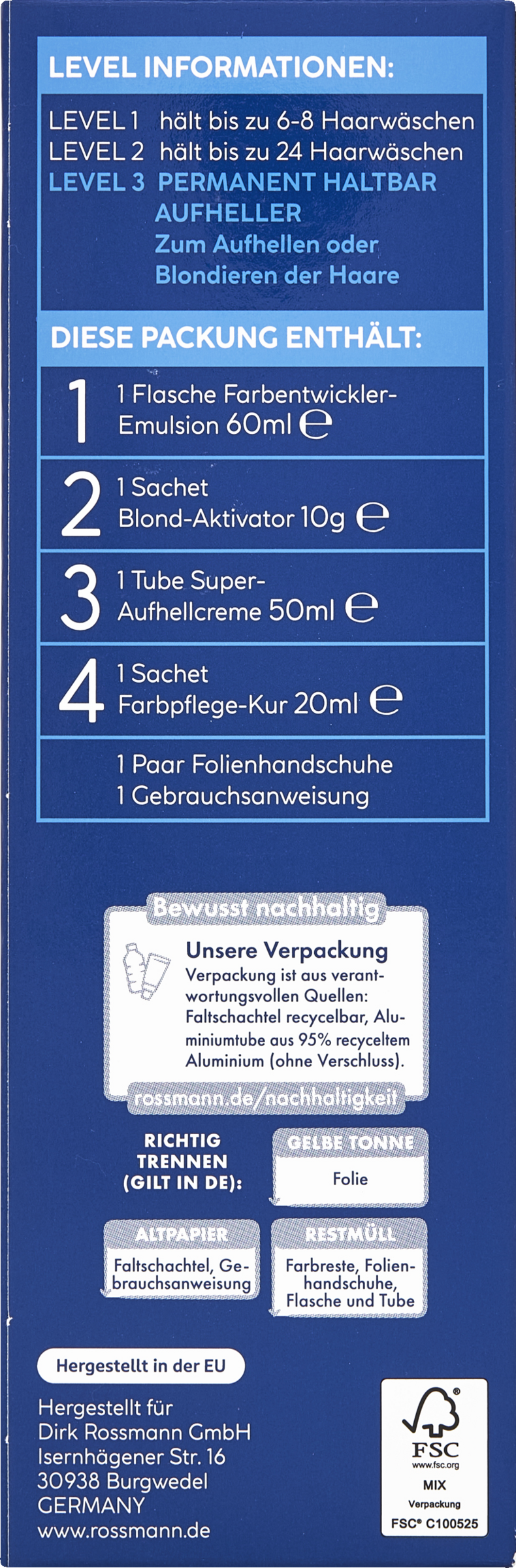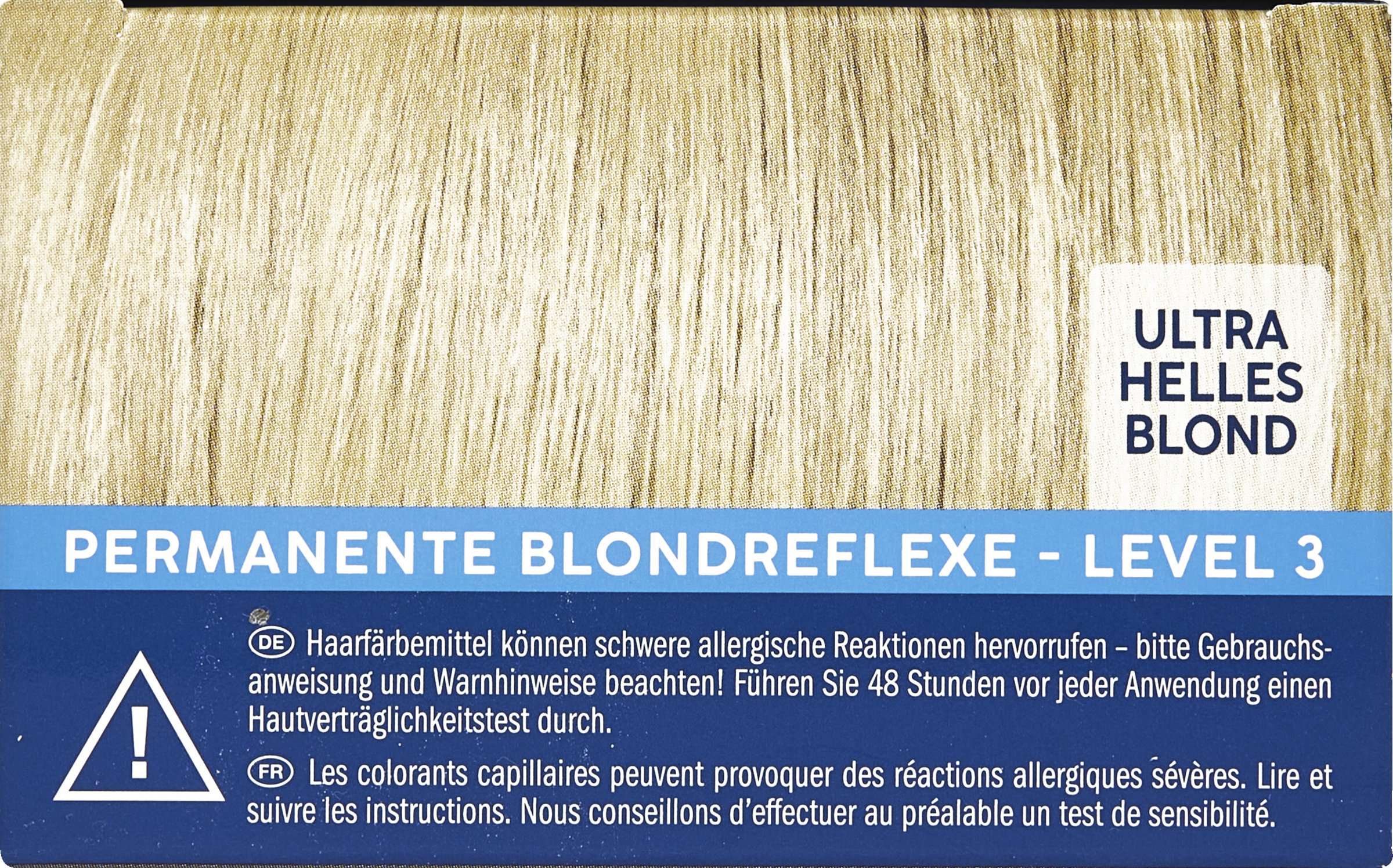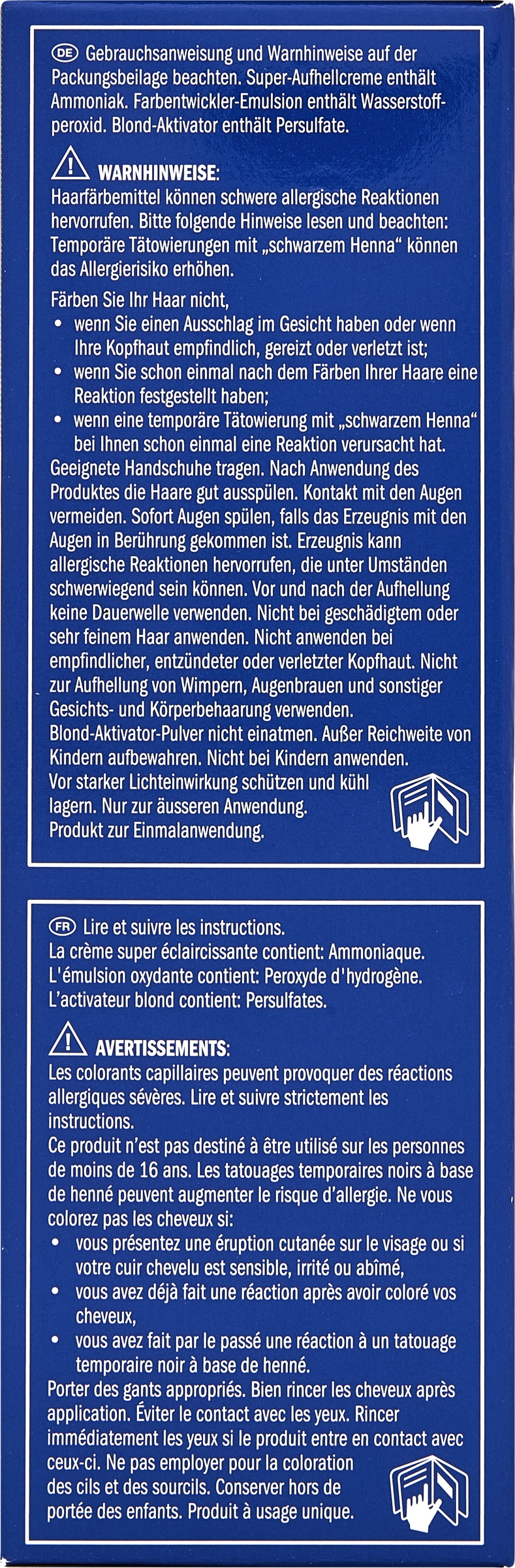 Super-Aufhellcreme enthält Ammoniak.Farbentwickler-Emulsion enthält Wasserstoffperoxid. Blond-Aktivator enhält Persulfate. Geeignete Handschuhe tragen. Nach Anwendung des Produktes die Haare gut ausspülen. Kontakt mit den Augen vermeiden. Sofort Augen spülen, falls das Erzeugnis mit den Augen in Berührung gekommen ist. Erzeugnis kann allergische Reaktionen hervorrufen, die unter Umständen schwerwiegend sein können. Gebrauchsanweisung und Warnhinweise auf der Packungsbeilage beachten. Vor und nach der Aufhellung keine Dauerwelle verwenden. Nicht bei geschädigtem Haar oder sehr feinem Haar anwenden. Nicht anwenden bei empfindlicher, entzündeter oder verletzter Kopfhaut. Nicht zur Aufhellung von Wimpern, Augenbrauen und sonstiger Gesichts- und Körperbehaarung verwenden. Blond-Aktivator-Pulver nicht einatmen. Nicht bei Kindern anwenden. Nur zur äußeren Anwendung.