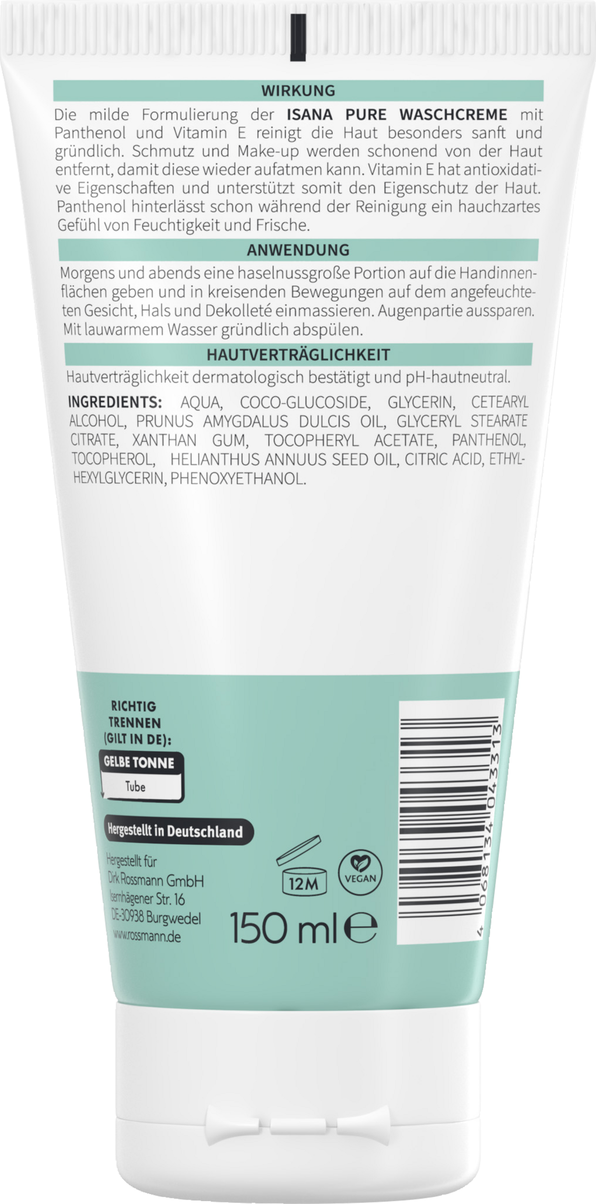 Die milde Formulierung der ISANA PURE WASCHCREME mit Panthenol und Vitamin E reinigt die Haut besonders sanft und gründlich. Schmutz und Make-up werden schonend von der Haut entfernt, damit diese wieder aufatmen kann. Vitamin E hat antioxidative Eigenschaften und unterstützt somit den Eigenschutz der Haut. Panthenol hinterlässt schon während der Reinigung ein hauchzartes Gefühl von Feuchtigkeit und Frische.