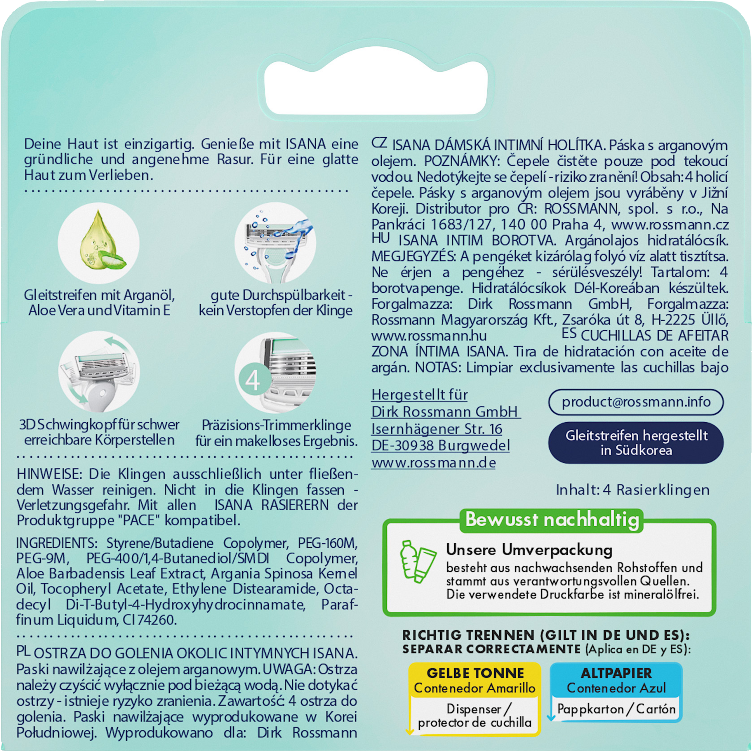 Die Klingen ausschließlich unter fließendem Wasser reinigen. Nicht in die Klingen fassen - Verletzungsgefahr. Mit allen ISANA Rasieren der Produktgruppe "Pace" kompatibel.