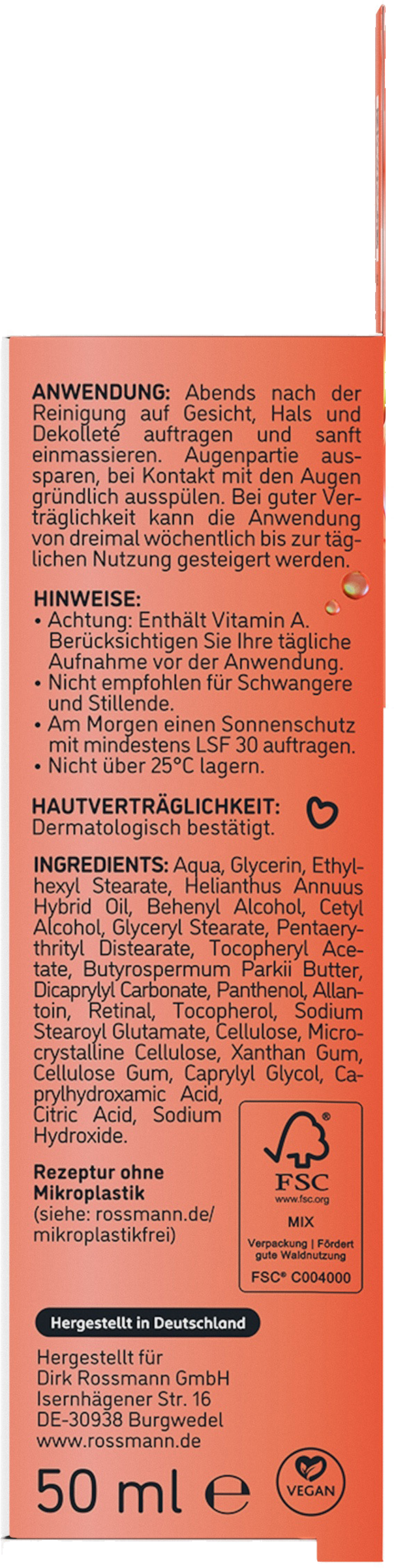 Achtung: Enthält Vitamin A. Berücksichtigen Sie Ihre tägliche Aufnahme vor der Anwendung. Nicht empfohlen für Schwangere und Stillende. Am Morgen einen Sonnenschutz mit mindestens LSF 30 auftragen. Nicht über 25°C lagern.