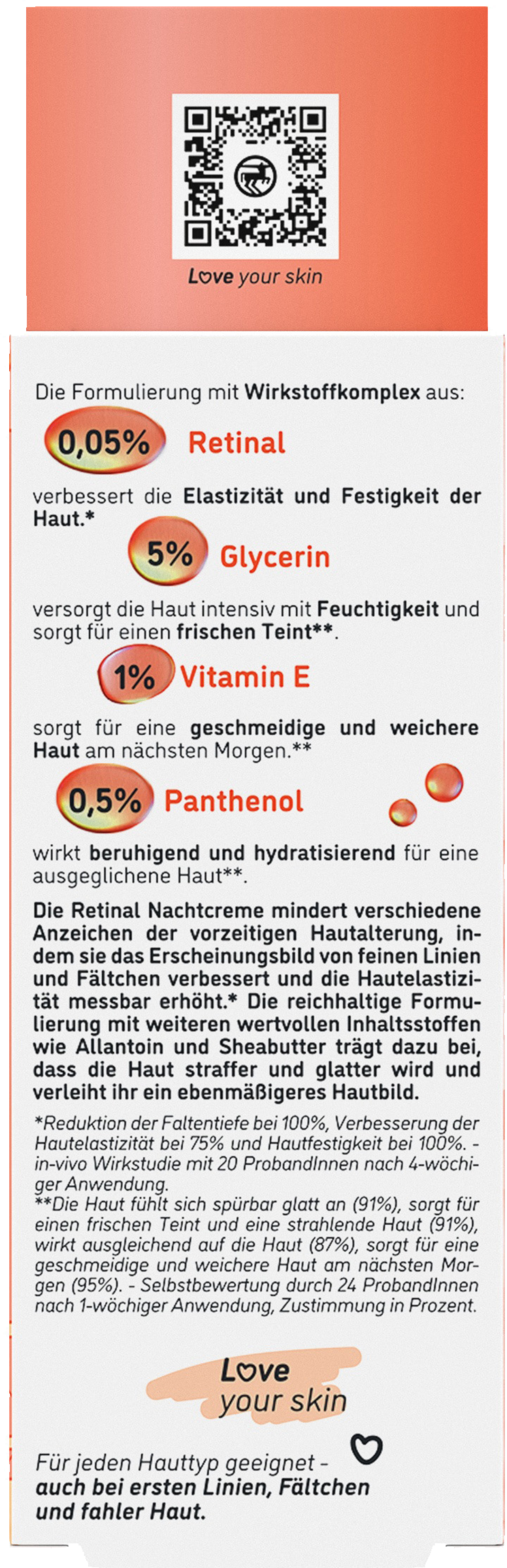 - Formulierung mit Wirkstoffkomplex aus 0,05% Retinal verbessert die Elastizität und Festigkeit der Haut*