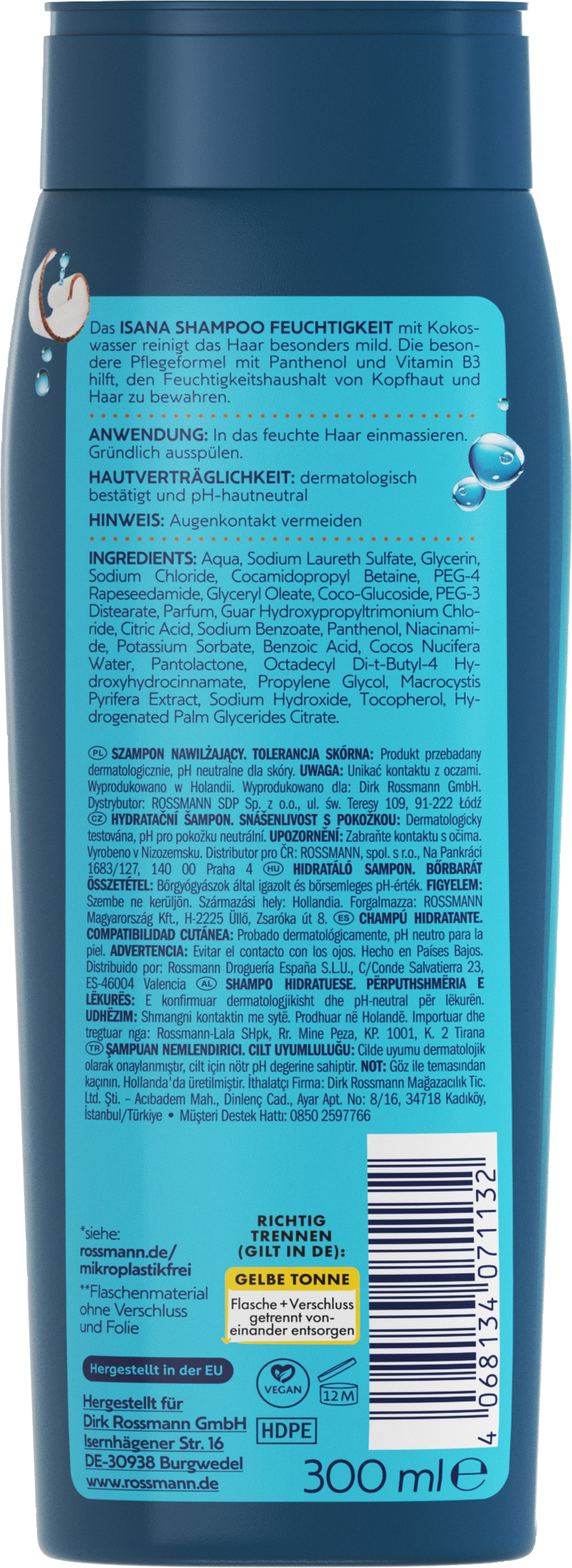 Das ISANA SHAMPOO FEUCHTIGKEIT mit Kokoswasser reinigt das Haar besonders mild. Die besondere Pflegeformel mit Panthenol und Vitamin B3 hilft, den Feuchtigkeitshaushalt von Kopfhaut und Haar zu bewahren.