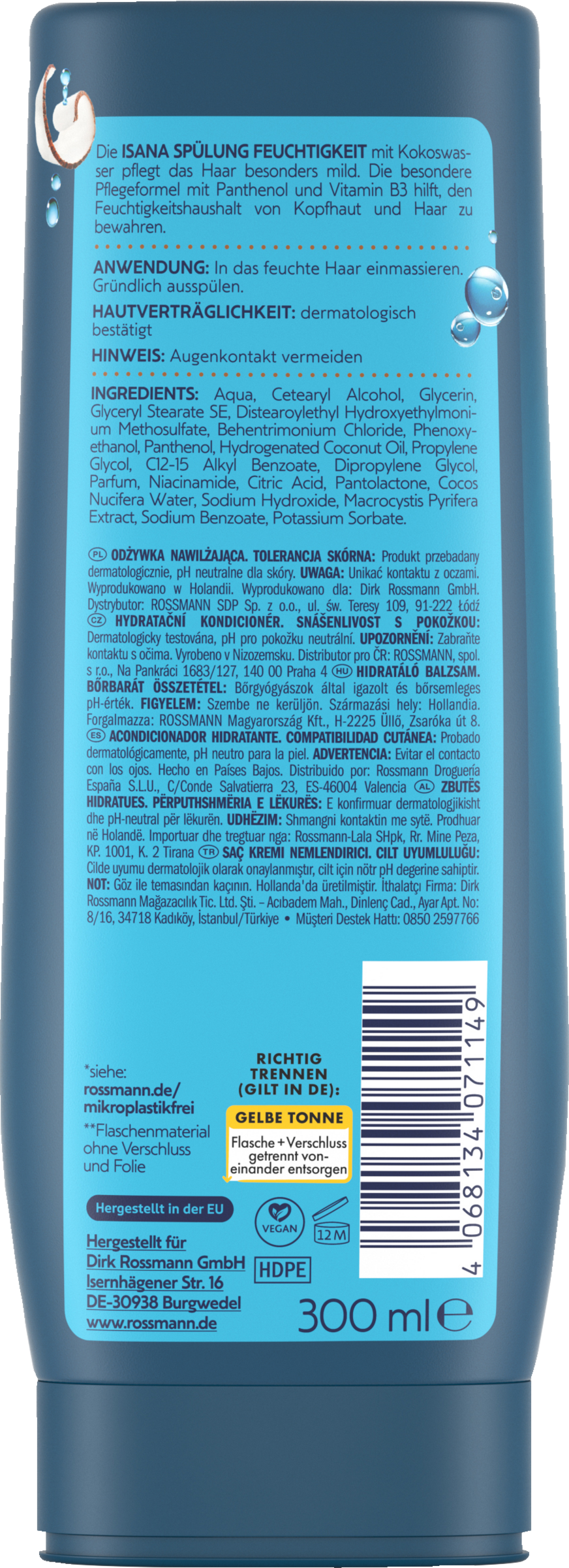 Die ISANA SPÜLUNG FEUCHTIGKEIT mit Kokoswasser pflegt das Haar besonders mild. Die besondere Pflegeformel mit Panthenol und Vitamin B3 hilft, den Feuchtigkeitshaushalt von Kopfhaut und Haar zu bewahren.