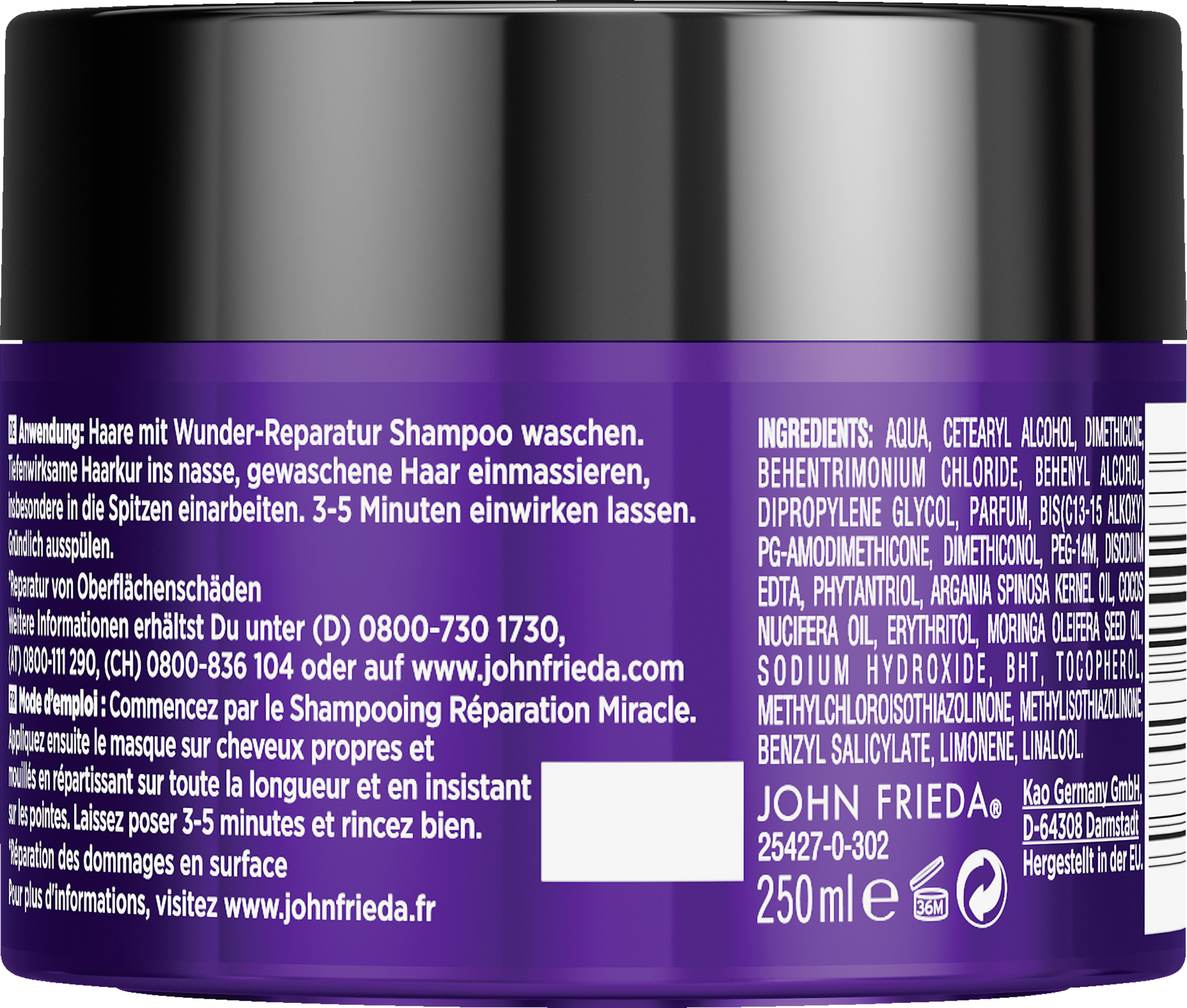 Tiefenwirksame Haarkur ins nasse, gewaschene Haar einmassieren, insbesondere in die Spitzen einarbeiten. 3-5 Minuten einwirken lassen. Gründlich ausspülen.