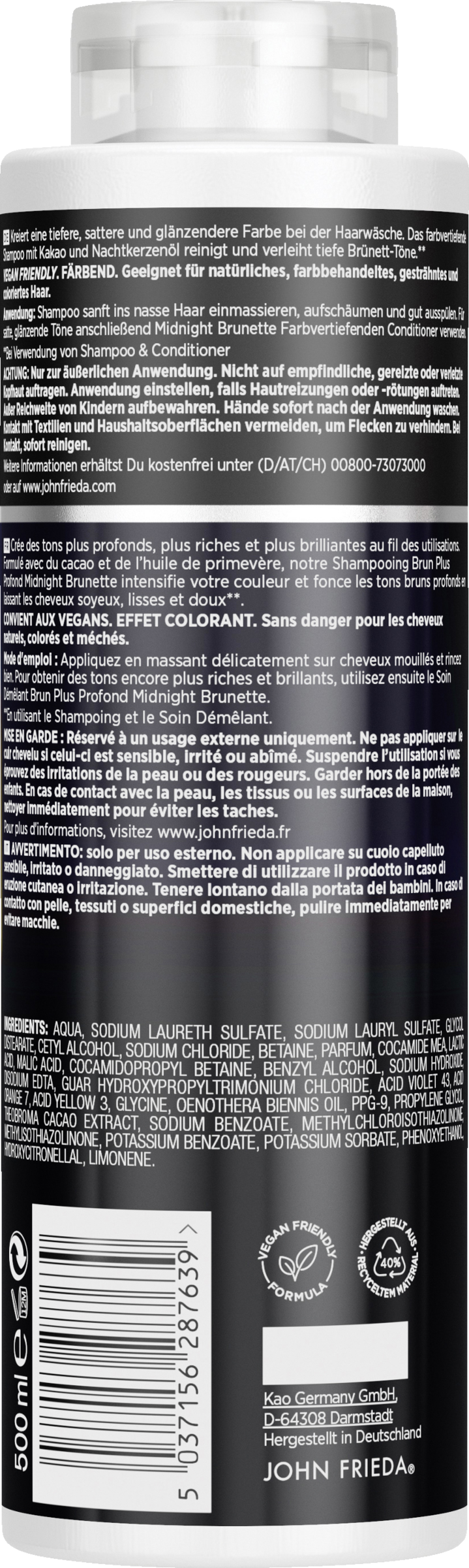 Die farbvertiefende Serie John Frieda Midnight Brunette verleiht tiefe Brünett-Töne - bei Verwendung von Shampoo und Conditioner. Das farbvertiefende Shampoo mit Kakao und Nachtkerzenöl reinigt und kreiert tiefere, sattere und glänzendere Farbe bei der Haarwäsche.