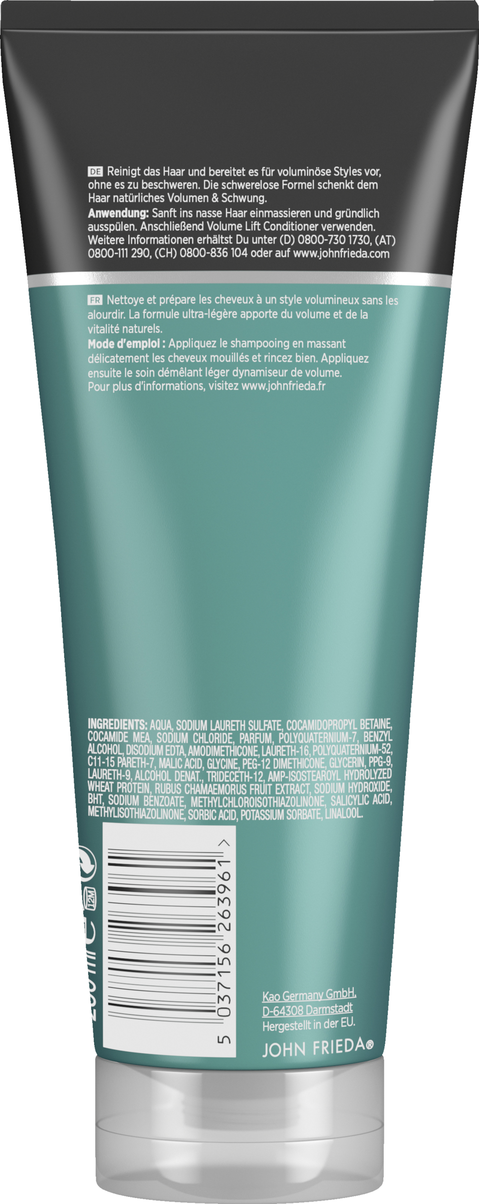 Aqua, Sodium Laureth Sulfate, Cocamidopropyl Betaine, Cocamide MEA, Sodium Chloride, Parfum, Polyquaternium-7, Benzyl Alcohol, Disodium EDTA, Amodimethicone, Laureth-16, Polyquaternium-52, C11-15 Pareth-7, Malic Acid, Glycine, PEG-12 Dimethicone, Glycerin, PPG-9, Laureth-9, Alcohol Denat., Trideceth-12, AMP-Isostearoyl Hydrolyzed Wheat Protein, Rubus Chamaemorus Fruit Extract, Sodium Hydroxide, BHT, Sodium Benzoate, Methylchloroisothiazolinone, Salicylic Acid, Methylisothiazolinone, Sorbic Acid, Potassium Sorbate, Linalool.