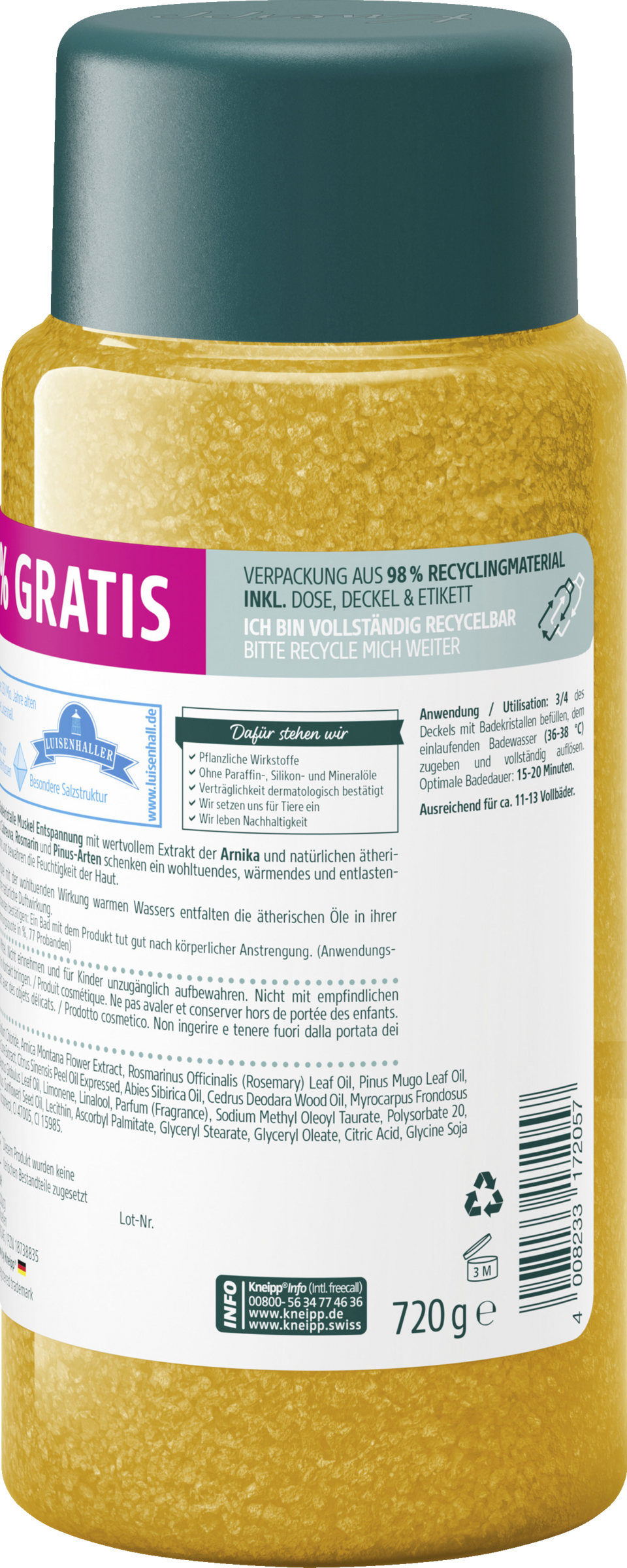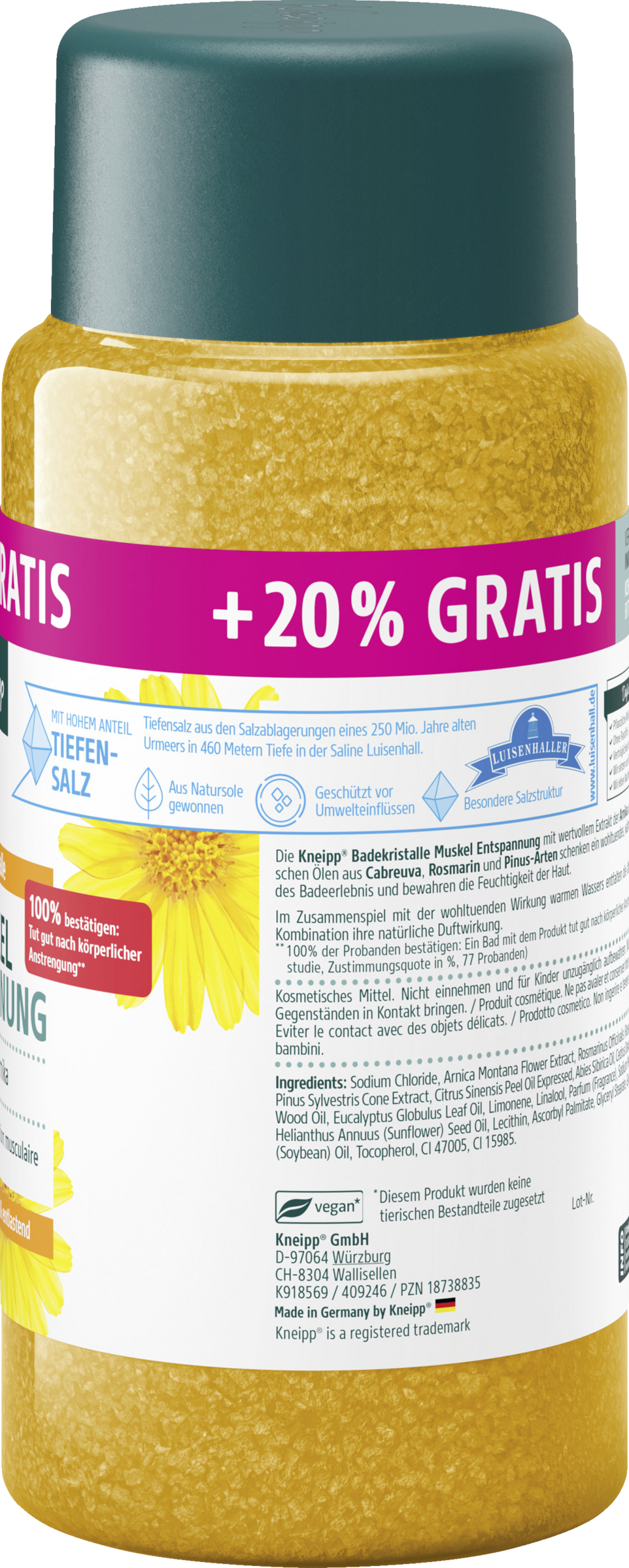 Die Kneipp® Badekristalle Muskel Entspannung mit wertvollem Extrakt der Arnika und natürlichen ätherischen Ölen aus Cabreuva, Rosmarin und Pinus-Arten schenken ein wohltuendes, wärmendes und entlastendes Badeerlebnis und bewahren die Feuchtigkeit der Haut.