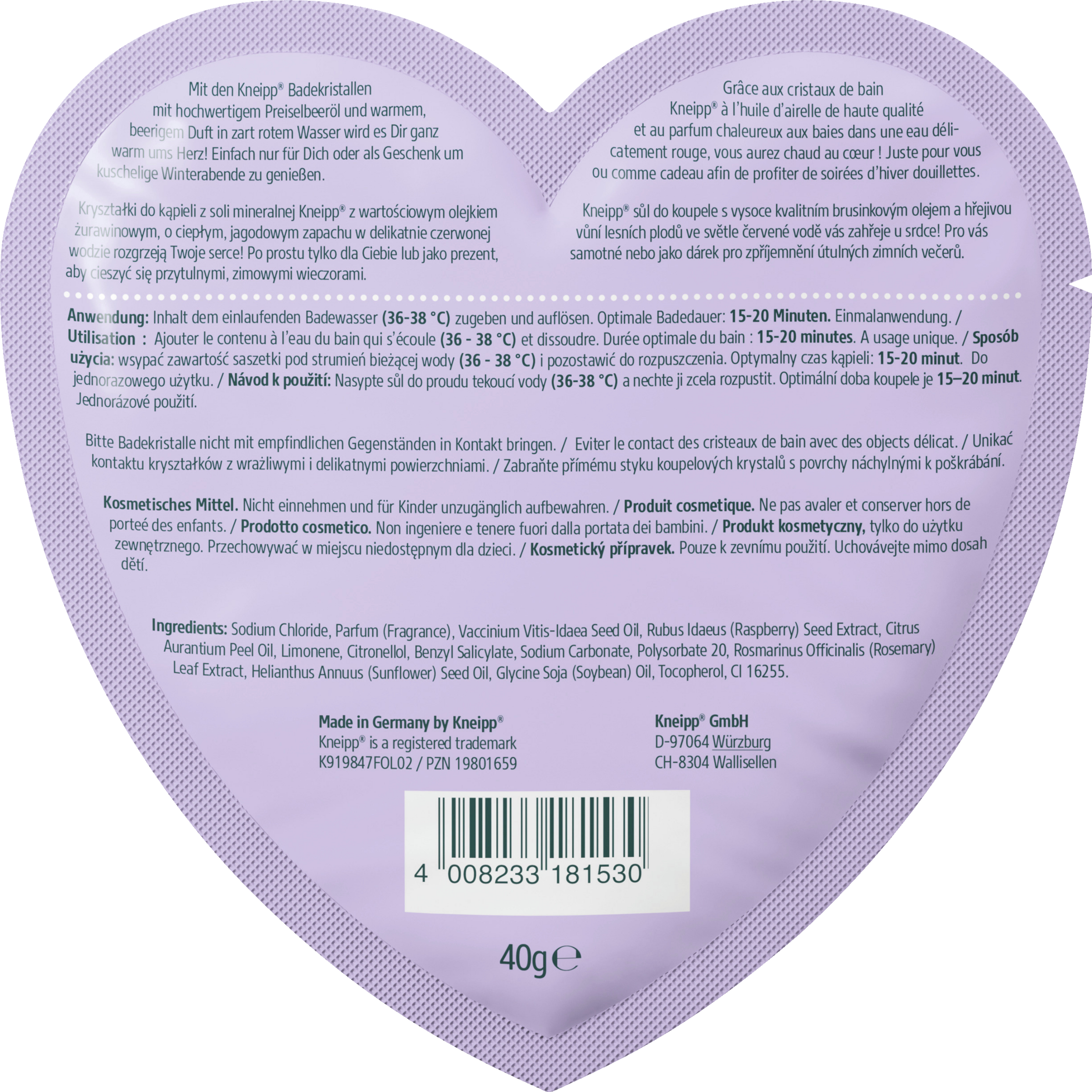 Mit den Kneipp® Badekristallen mit hochwertigem Preiselbeeröl und warmem, beerigem Duft in zart rotem Wasser wird es Dir ganz warm ums Herz! Einfach nur für Dich oder als Geschenk um kuschelige Winterabende zu genießen.