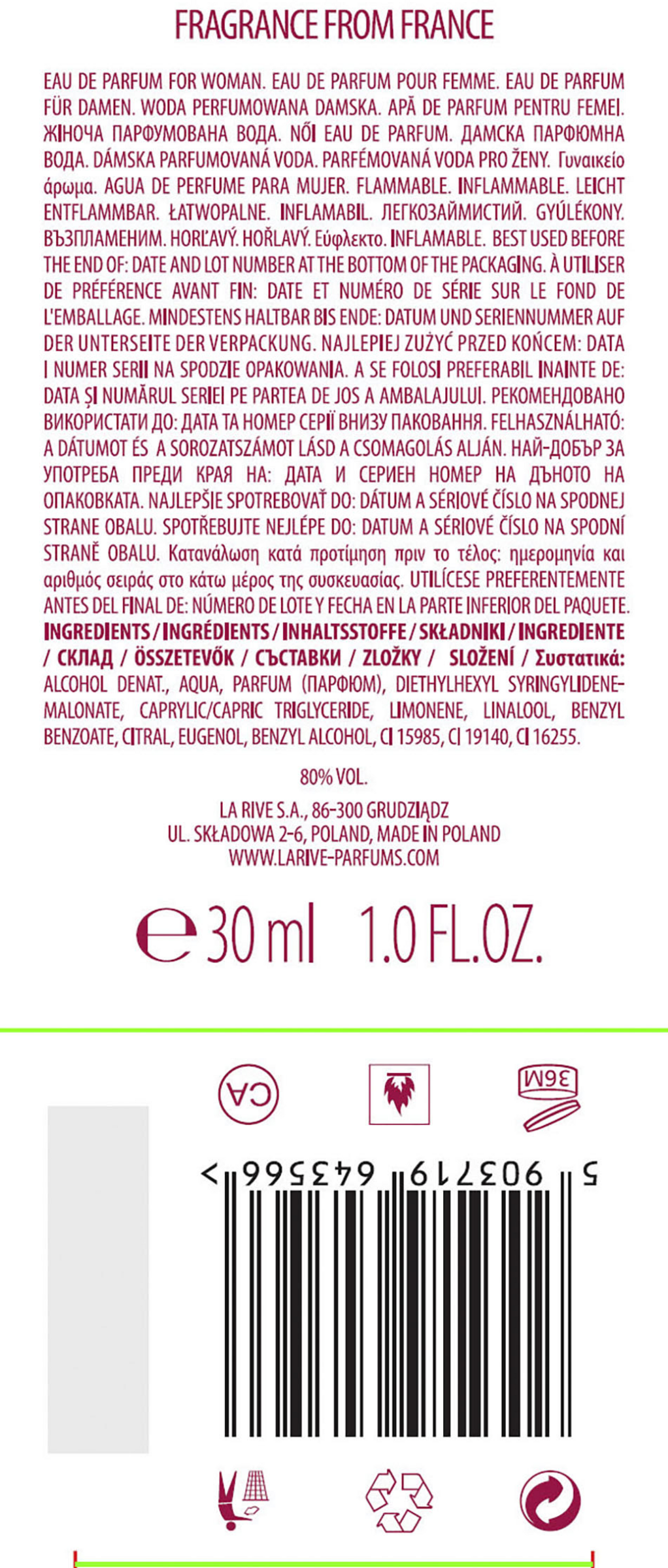 Alcohol Denat., Aqua, Parfum (парфюм), Diethylhexyl Syringylidenemalonate, Caprylic/Capric Triglyceride, Limonene, Linalool, Benzyl Benzoate, Citral, Eugenol, Benzyl Alcohol, CI 15985, CI 19140, CI 16255.