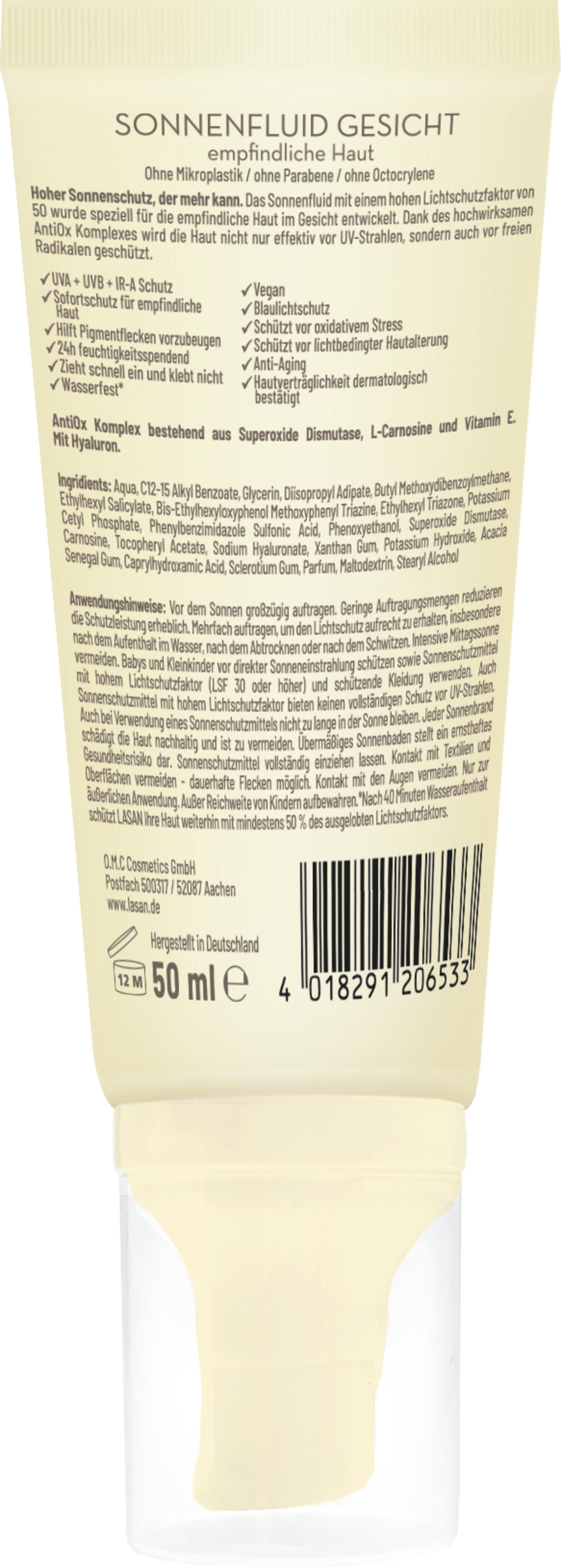 Das LASAN Sonnenfluid für das Gesicht verfügt über einen hohen Lichtschutzfaktor 50 und bietet deiner Haut das, was sie während eines Sonnenbades braucht. Dank des hochwirksamen Antiox-Komplexes bestehend aus Superoxide Dismutase, L-Carnosine und Vitamin E, wird deine Haut effektiv vor UV-Strahlen und freien Radikalen geschützt - jeden Tag.