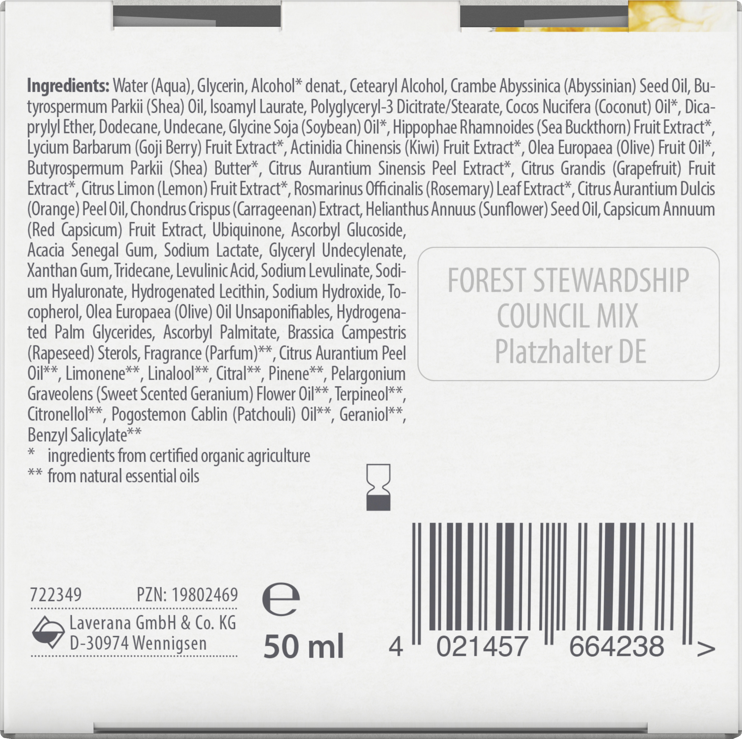 Water (Aqua), Glycerin, Alcohol* denat., Cetearyl Alcohol, Crambe Abyssinica (Abyssinian) Seed Oil, Butyrospermum Parkii (Shea) Oil, Isoamyl Laurate, Polyglyceryl-3 Dicitrate/Stearate, Cocos Nucifera (Coconut) Oil*, Dicaprylyl Ether, Dodecane, Undecane, Glycine Soja (Soybean) Oil*, Hippophae Rhamnoides (Sea Buckthorn) Fruit Extract*, Lycium Barbarum (Goji Berry) Fruit Extract*, Actinidia Chinensis (Kiwi) Fruit Extract*, Olea Europaea (Olive) Fruit Oil*, Butyrospermum Parkii (Shea) Butter*, Citrus Aurantium Sinensis Peel Extract*, Citrus Grandis (Grapefruit) Fruit Extract*, Citrus Limon (Lemon) Fruit Extract*, Rosmarinus Officinalis (Rosemary) Leaf Extract*, Citrus Aurantium Dulcis (Orange) Peel Oil, Chondrus Crispus (Carrageenan) Extract, Helianthus Annuus (Sunflower) Seed Oil, Capsicum Annuum (Red Capsicum) Fruit Extract, Ubiquinone, Ascorbyl Glucoside, Acacia Senegal Gum, Sodium Lactate, Glyceryl Undecylenate, Xanthan Gum, Tridecane, Levulinic Acid, Sodium Levulinate, Sodium Hyaluronate, Hydrogenated Lecithin, Sodium Hydroxide, Tocopherol, Olea Europaea (Olive) Oil Unsaponifiables, Hydrogenated Palm Glycerides, Ascorbyl Palmitate, Brassica Campestris (Rapeseed) Sterols, Fragrance (Parfum)**, Citrus Aurantium Peel Oil**, Limonene**, Linalool**, Citral**, Pinene**, Pelargonium Graveolens (Sweet Scented Geranium) Flower Oil**, Terpineol**, Citronellol**, Pogostemon Cablin (Patchouli) Oil**, Geraniol**, Benzyl Salicylate**