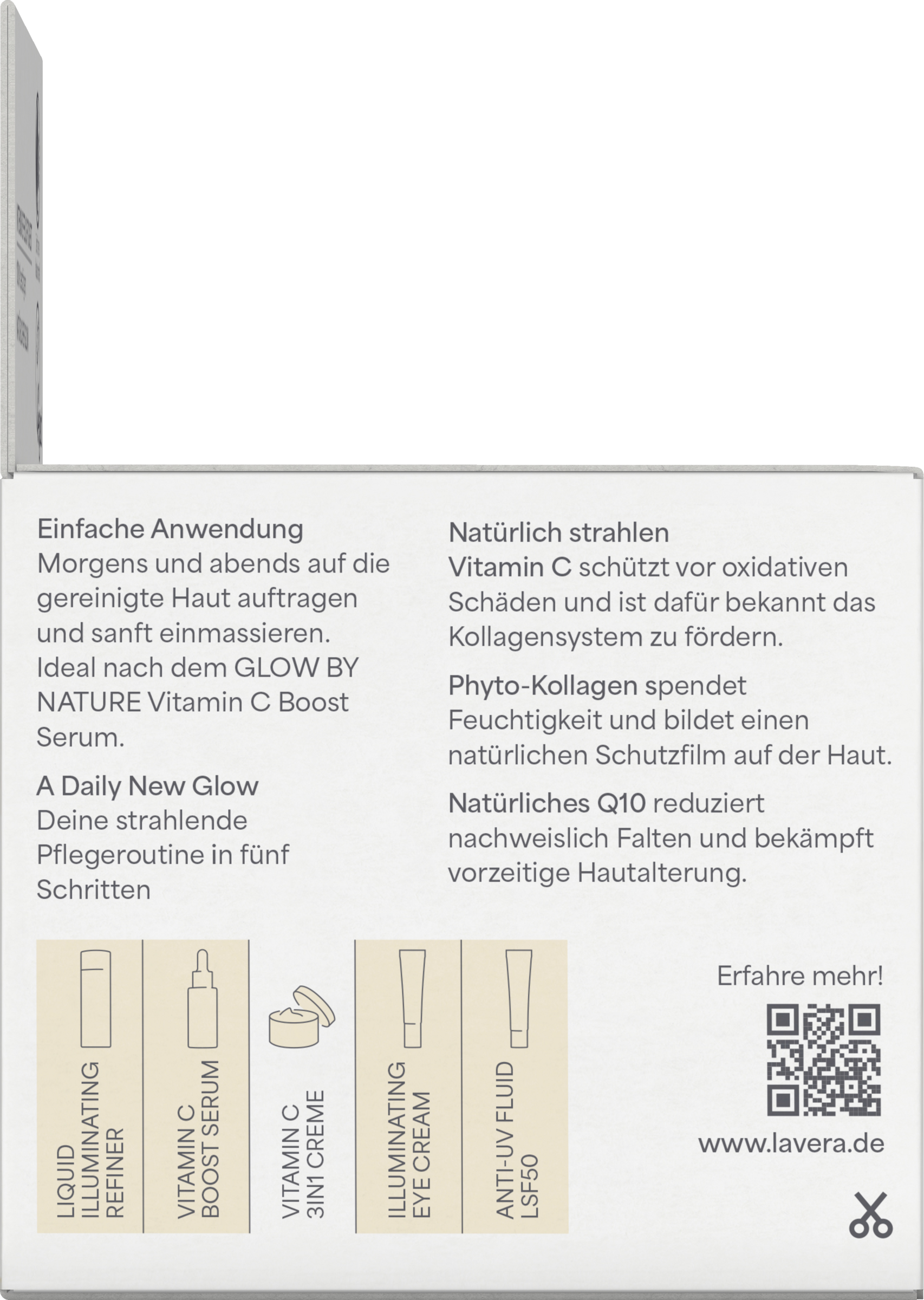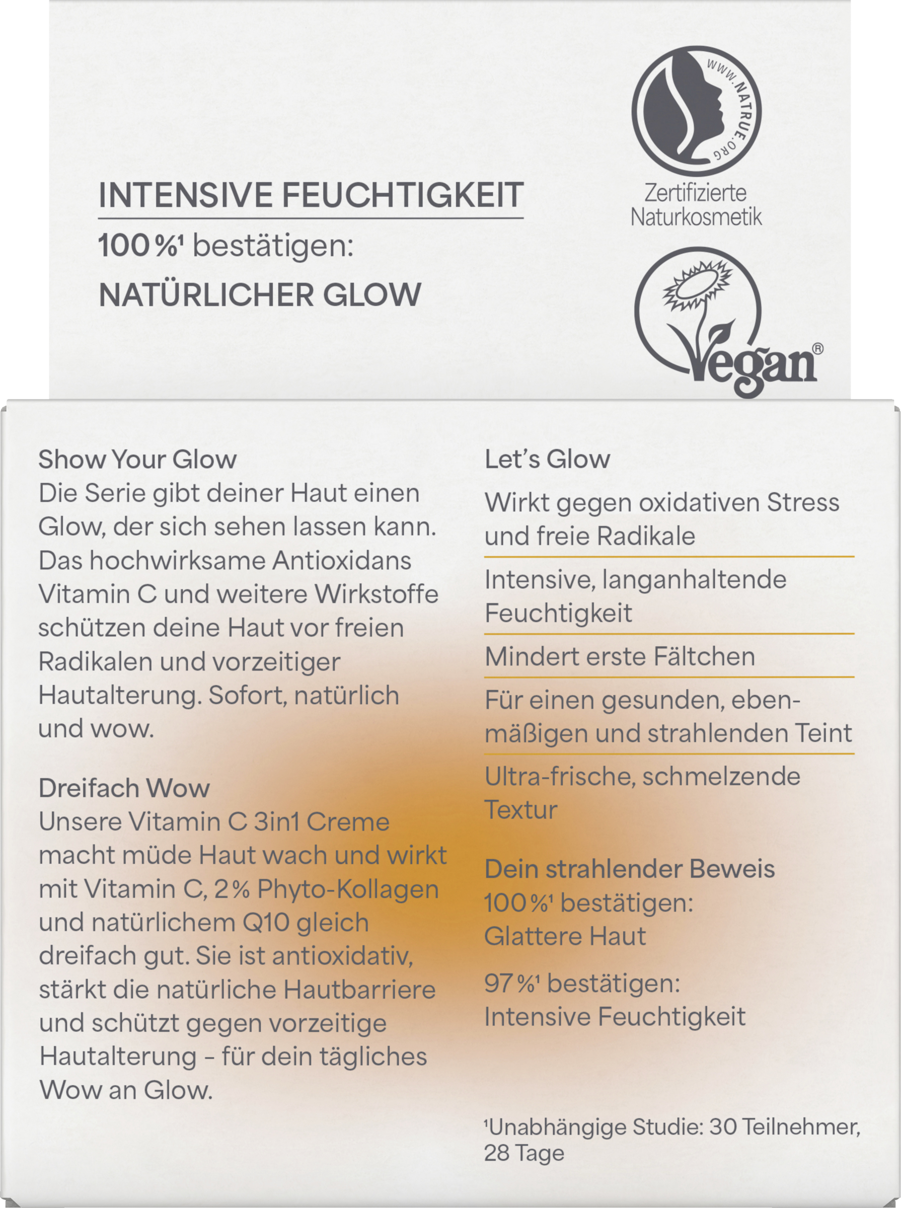 Die Serie gibt deiner Haut einen Glow, der sich sehen lassen kann. Das hochwirksame Antioxidans Vitamin C und weitere Wirkstoffe schützen deine Haut vor freien Radikalen und vorzeitiger Hautalterung. Sofort, natürlich und wow. Unsere Vitamin C 3in1 Creme macht müde Haut wach und wirkt mit Vitamin C, 2 % Phyto-Kollagen und natürlichem Q10 gleich dreifach gut. Sie ist antioxidativ, stärkt die natürliche Hautbarriere und schützt sie gegen vorzeitige Hautalterung – für dein tägliches Wow an Glow.