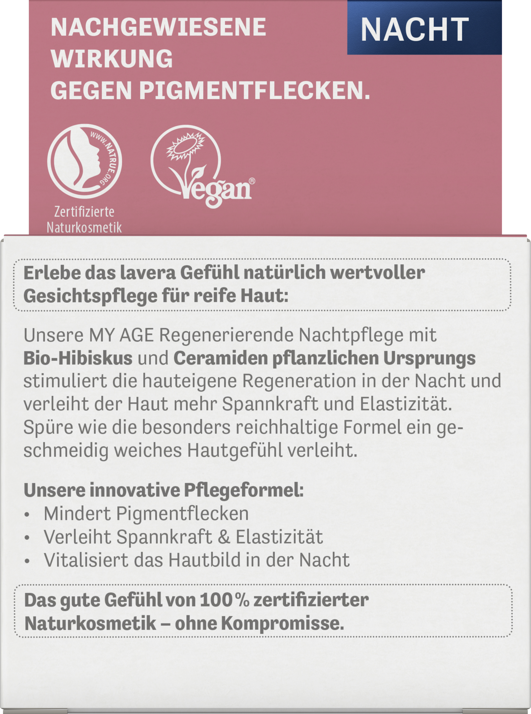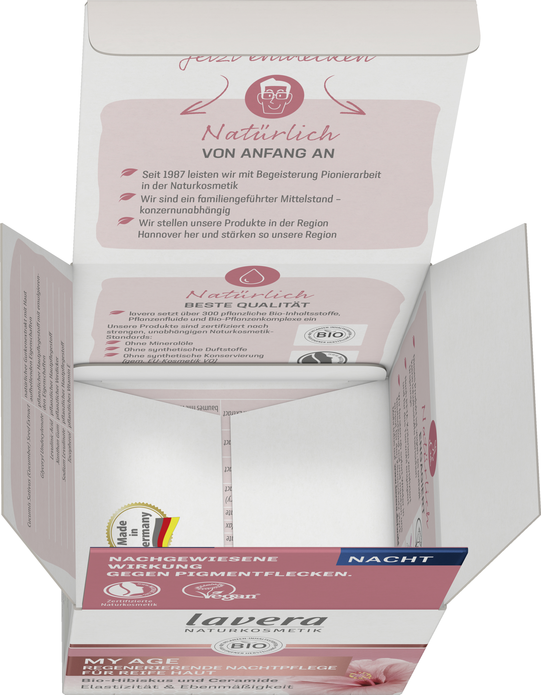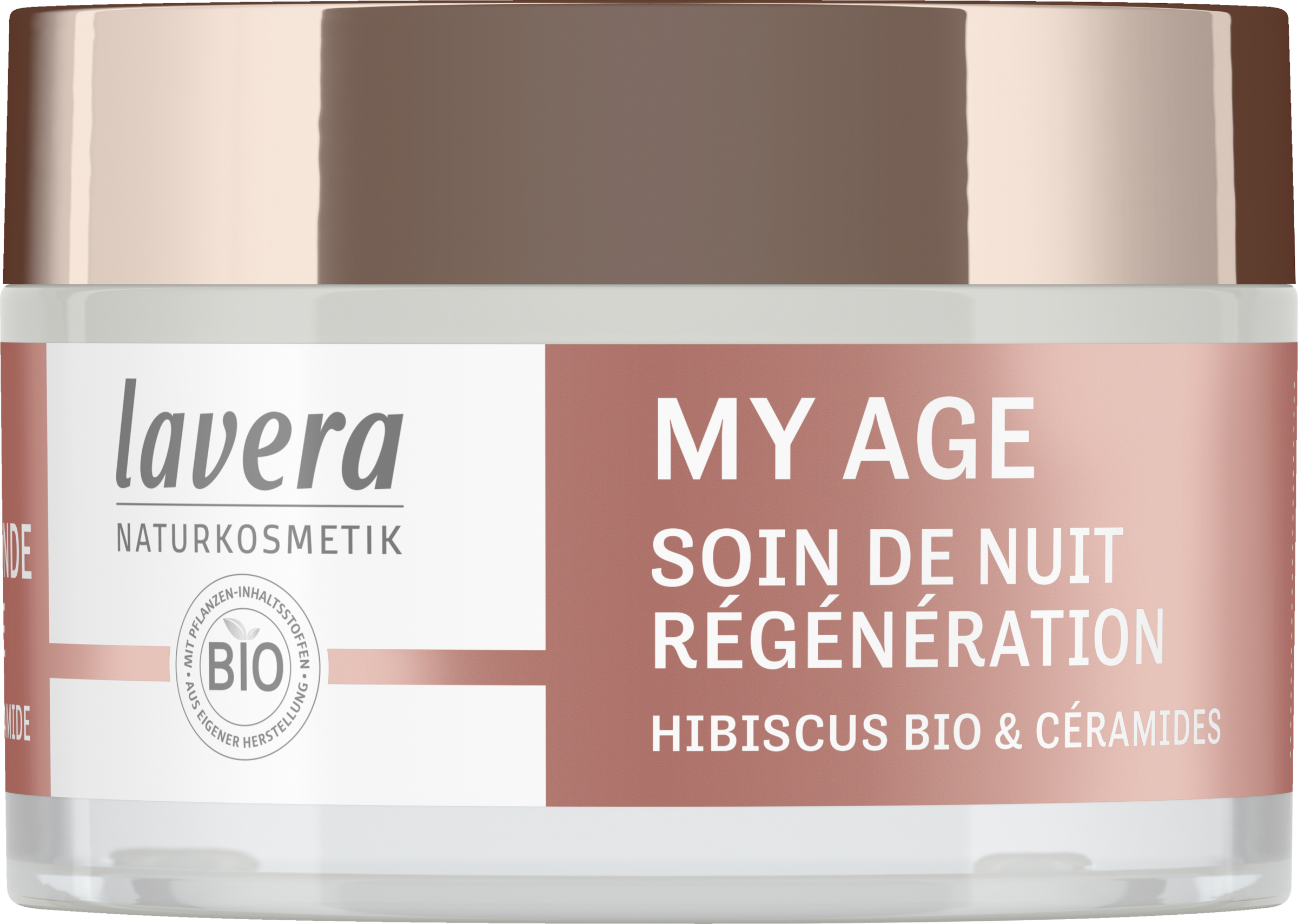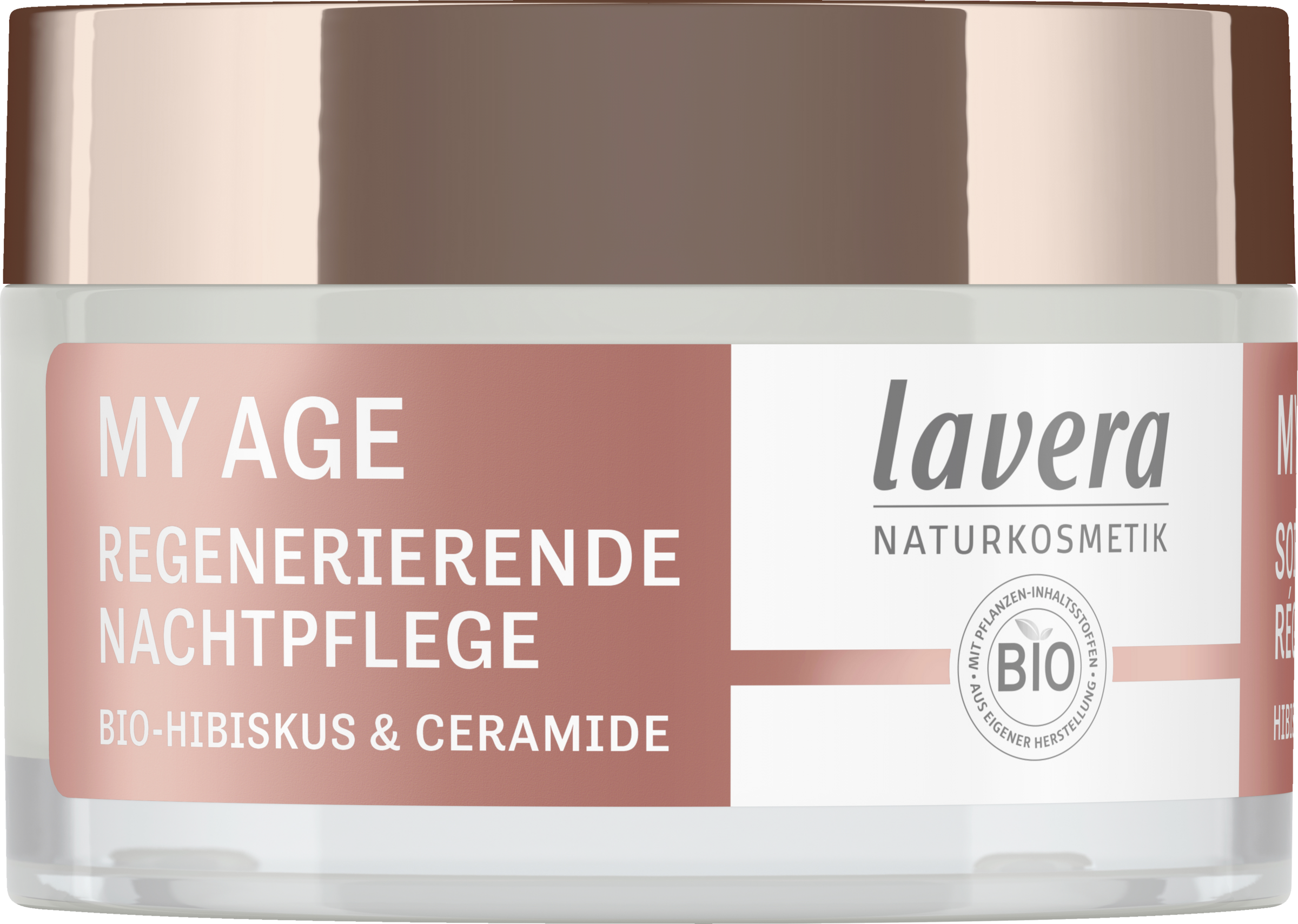 Erlebe das lavera Gefühl natürlich wertvoller Gesichtspflege für reife Haut: Die MY AGE Regenerierende Nachtpflege mit Bio-Hibiskus und Ceramiden pflanzlichen Ursprungs stimuliert die hauteigene Regeneration in der Nacht und verleiht der Haut mehr Spannkraft und Elastizität. Spüre wie die besonders reichhaltige Formel ein geschmeidig weiches Hautgefühl verleiht. Die innovative Pflegeformel: