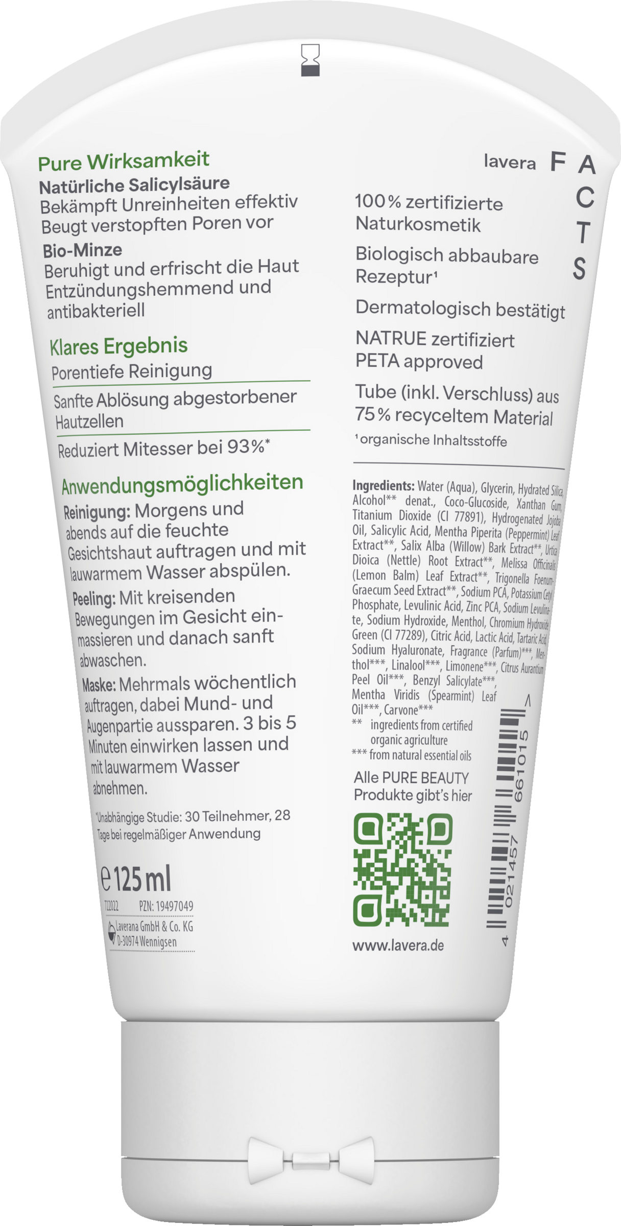 PURE WIRKSAMKEIT Natürliche Salicylsäure: Bekämpft Unreinheiten effektiv und beugt verstopften Poren vor Bio-Minze: Beruhigt und erfrischt die Haut, wirkt entzündungshemmend und antibakteriell