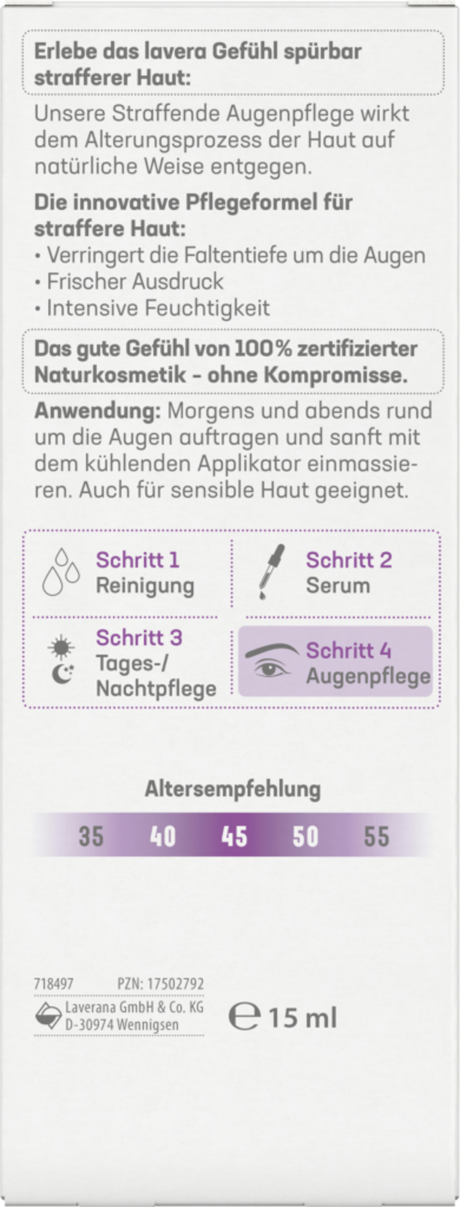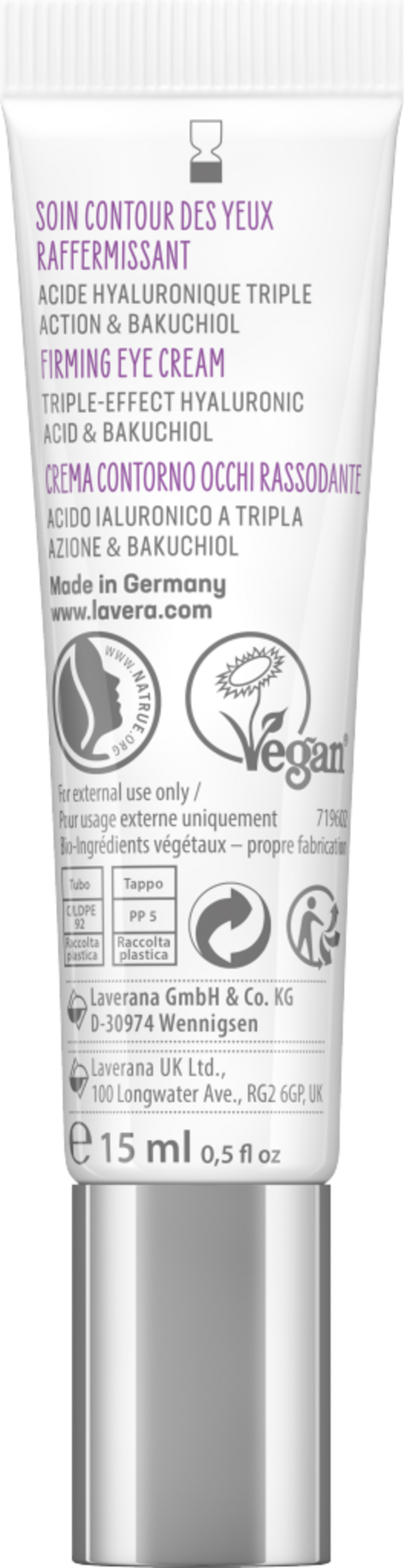 Erlebe das lavera Gefühl spürbar strafferer Haut. Die straffende Augenpflege mit 3-fach-Hyaluron und dem Power-Wirkstoff Bakuchiol verlangsamt aktiv den natürlichen Alterungsprozess der Haut. Die hochwirksame und gut verträgliche Formel stimuliert nachweislich das hauteigene Kollagensystem und mindert Falten. Spüre dank des speziell entwickelten Applikators einen angenehm kühlenden Effekt beim Auftragen und erlebe, wie die leichte Textur die zarte Haut deiner Augenpartie sanft umhüllt, feine Linien mindert und Schwellungen reduziert – für eine sichtbar geglättete Haut und einen frischen, wachen Blick.