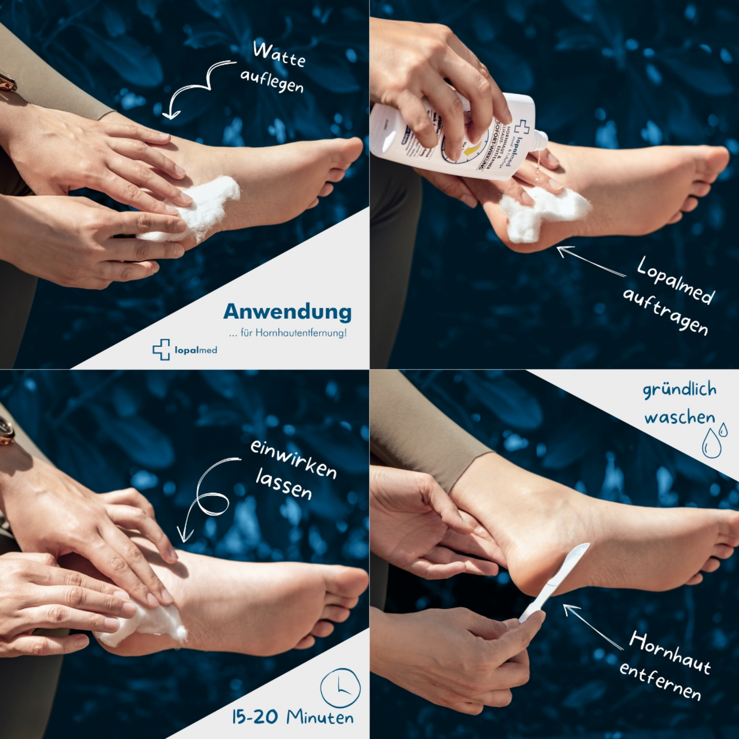 Vor der Anwendung muss die Hornhaut sehr trocken sein. Legen Sie eine dünne Schicht Lopalmed Watte (1) auf die zu behandelnden Stellen. Tränken Sie die Watte mit Lopalmed HORNHAUT & NAGELHAUT- ENTFERNER (2). Jetzt drücken Sie die Watte an die Hornhaut, damit die Watte gut haften bleibt. Nach ca. 10 Minuten können Sie nochmal etwas Entferner-Lotion auf die Watte geben, um die Wirkung zu intensivieren. Das Umwickeln mit Frischhaltefolie schenkt Ihnen zusätzlich Mobilität.