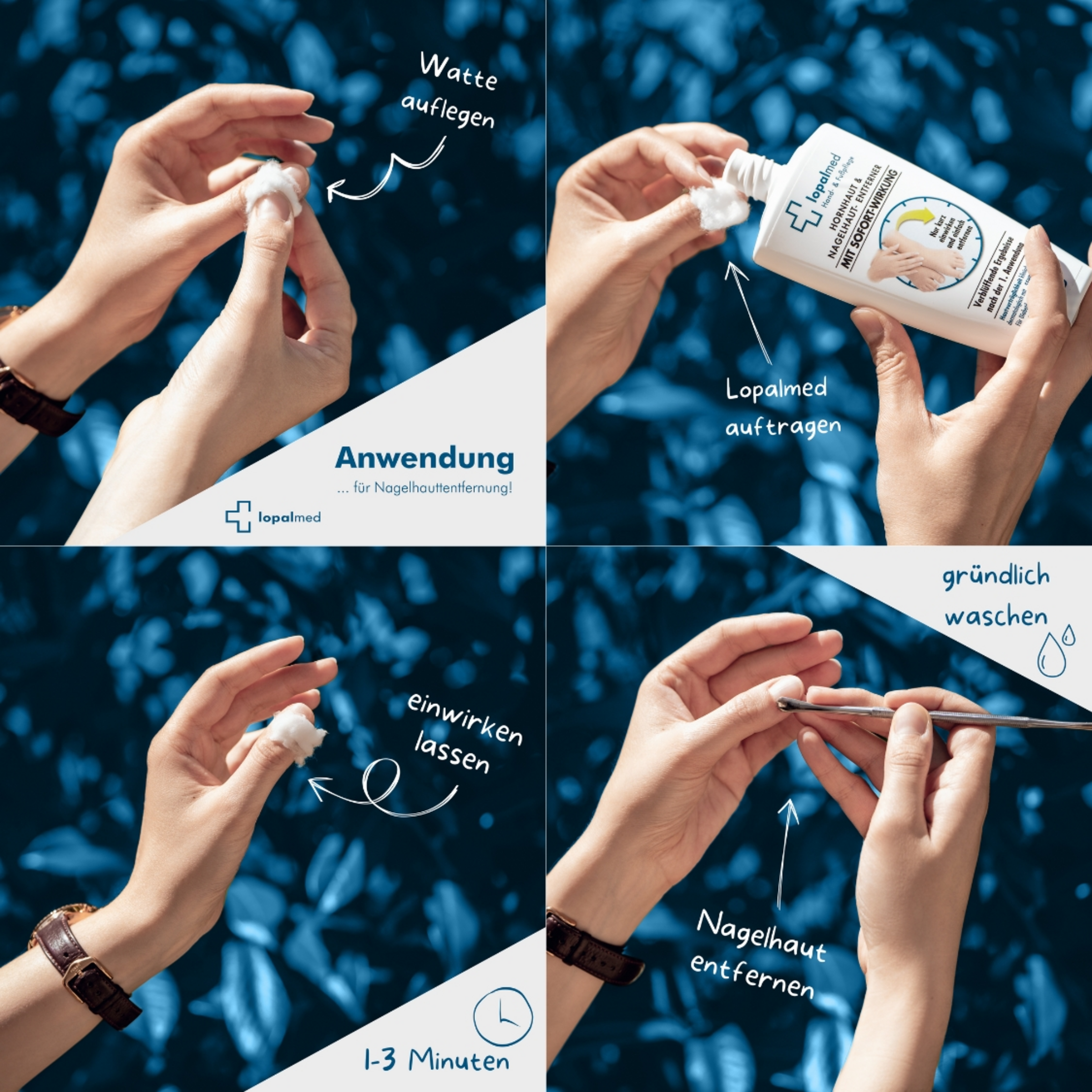 Vor der Anwendung muss die Nagelhaut sehr trocken sein. Legen Sie eine dünne Schicht Lopalmed Watte (1) auf die Nagelhaut. Tränken Sie die Watte mit Lopalmed HORNHAUT & NAGELHAUT-ENTFERNER (2). Eine Einwirkzeit von 1–3 Minuten genügt.