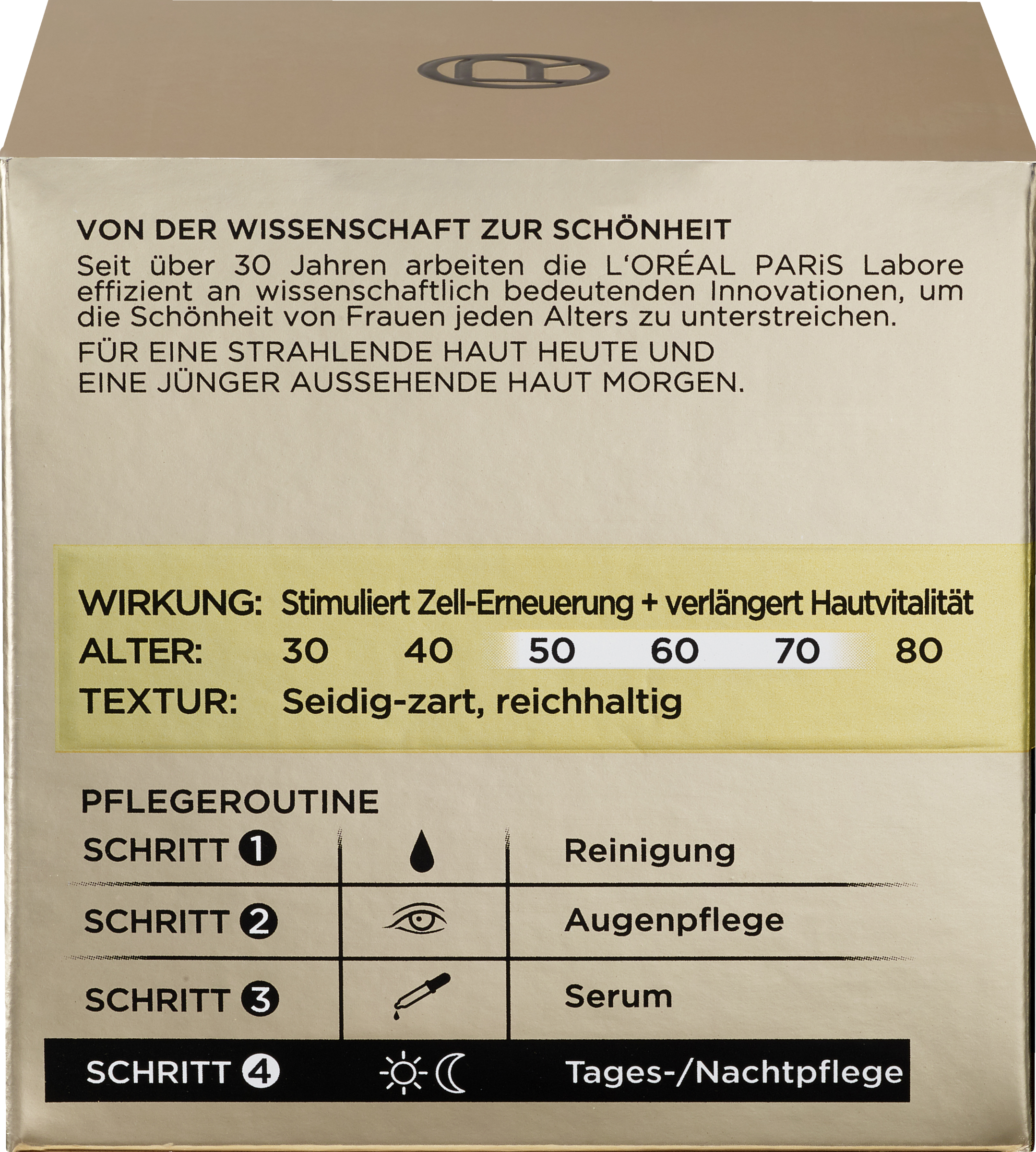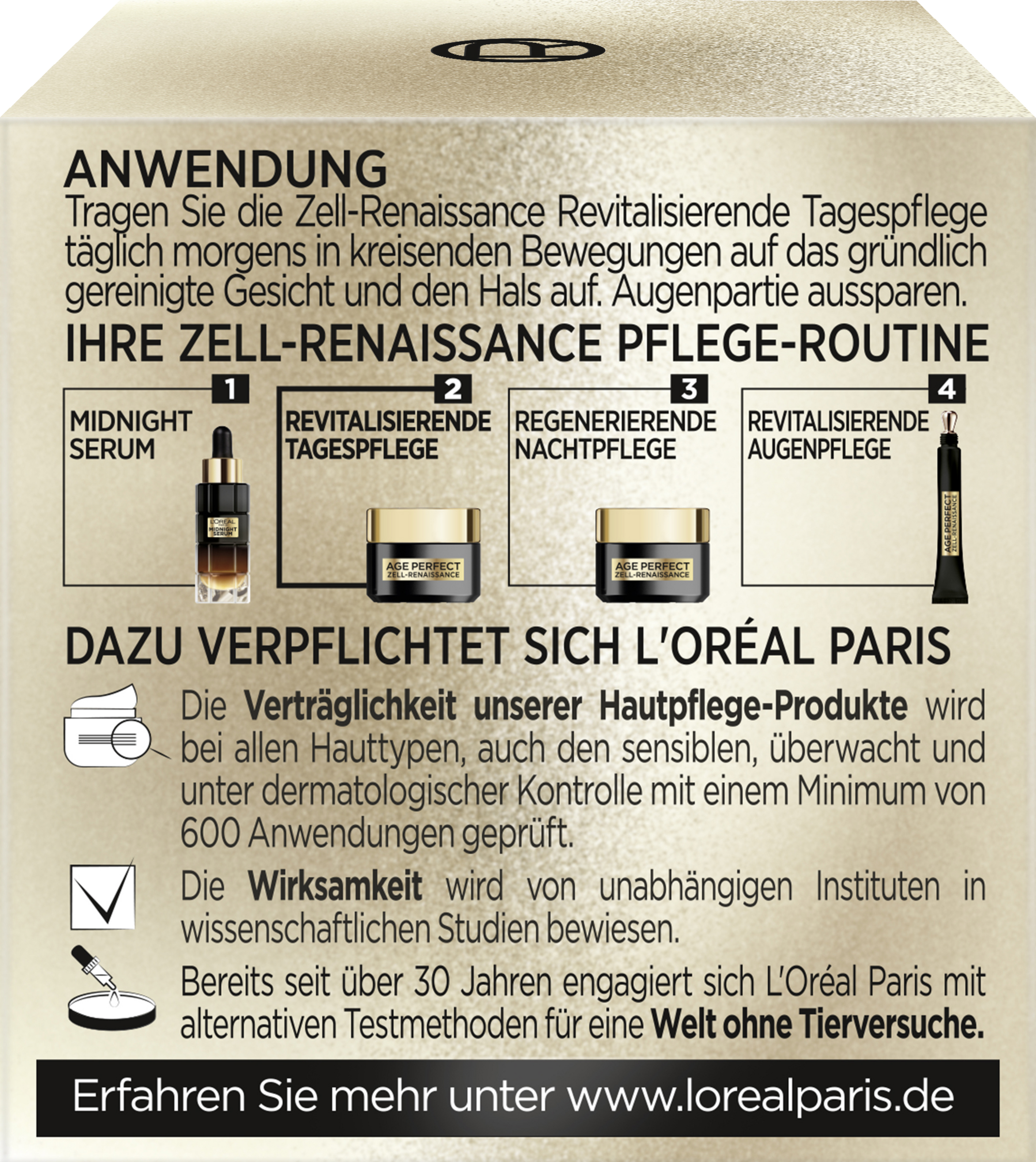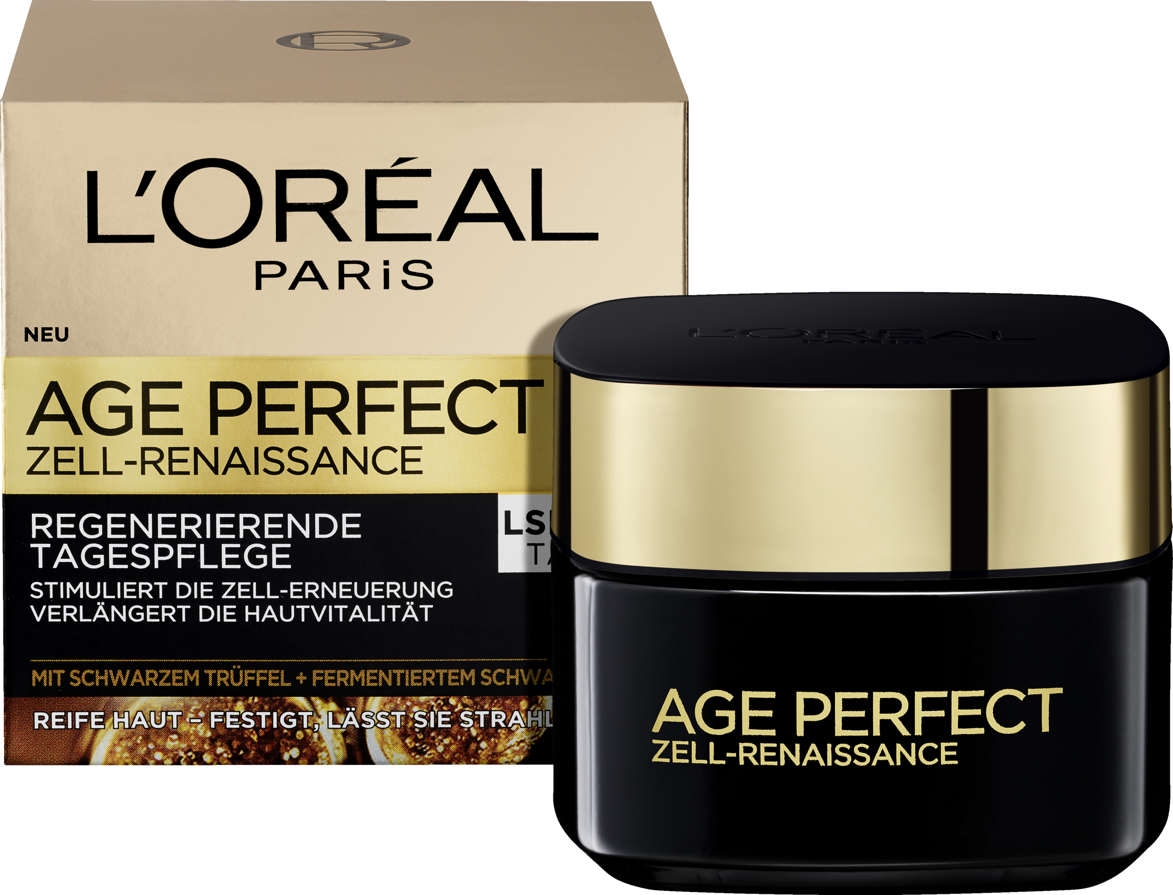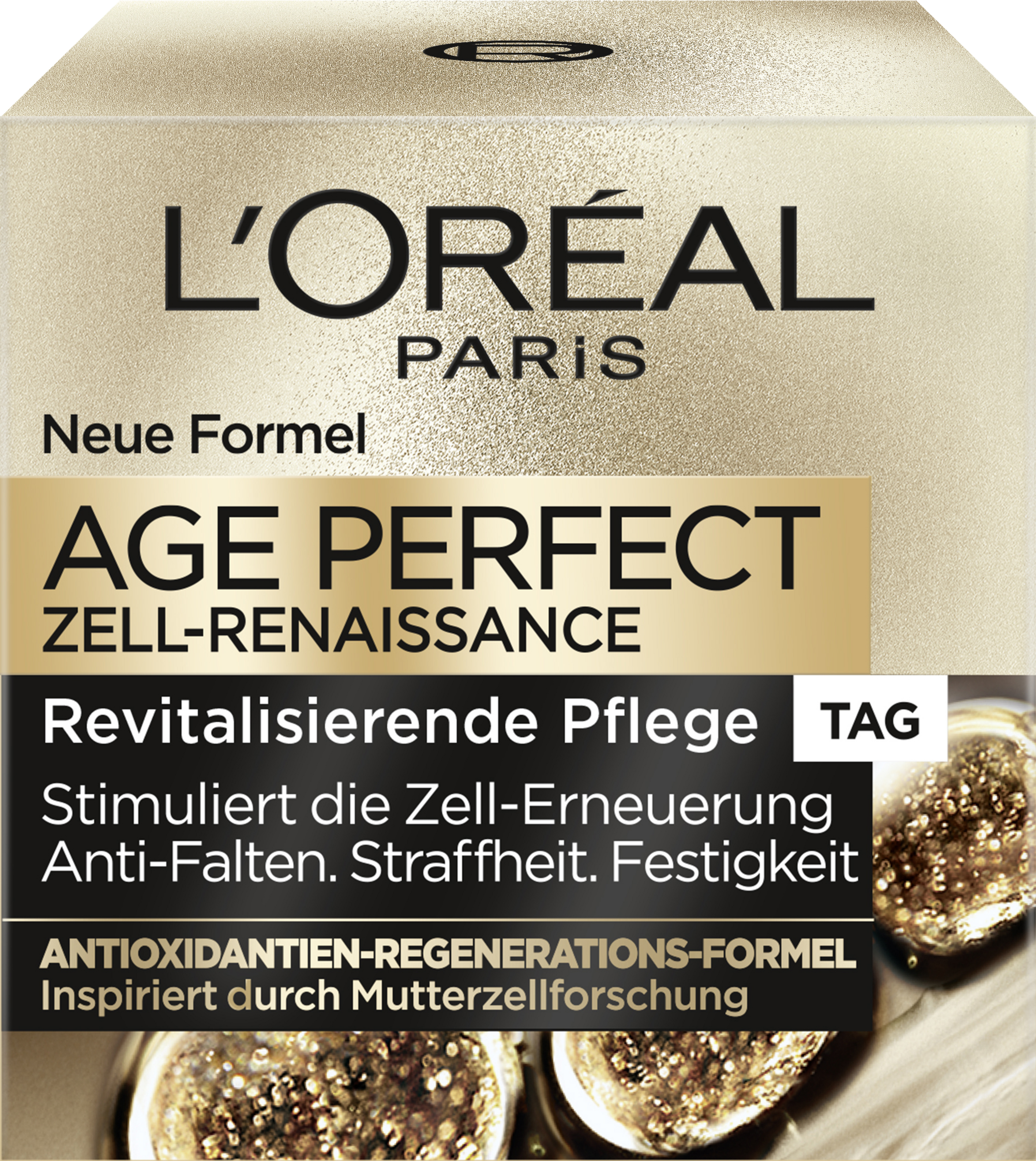 Entdecken Sie die Age Perfect Zell-Renaissance Tagespflege von L'Oréal Paris und erleben Sie eine strahlend schöne Haut: Die Tagespflege von L'Oréal Paris stimuliert die Zell-Erneuerung und schützt die Haut vor freien Radikalen. Ihre Antioxidantien Regenerations-Formel enthält zwei starke Antioxidantien, die Falten mildern und die Haut strahlender aussehen lassen. Die Tagespflege wird täglich morgens auf das gründlich gereinigte Gesicht und den Hals aufgetragen. Nach vier Wochen sind die Falten gemildert und die Haut sieht revitalisiert aus. Die Pflege ist für alle Hauttypen geeignet, auch für sensible Haut, und wurde in wissenschaftlichen Studien getestet.