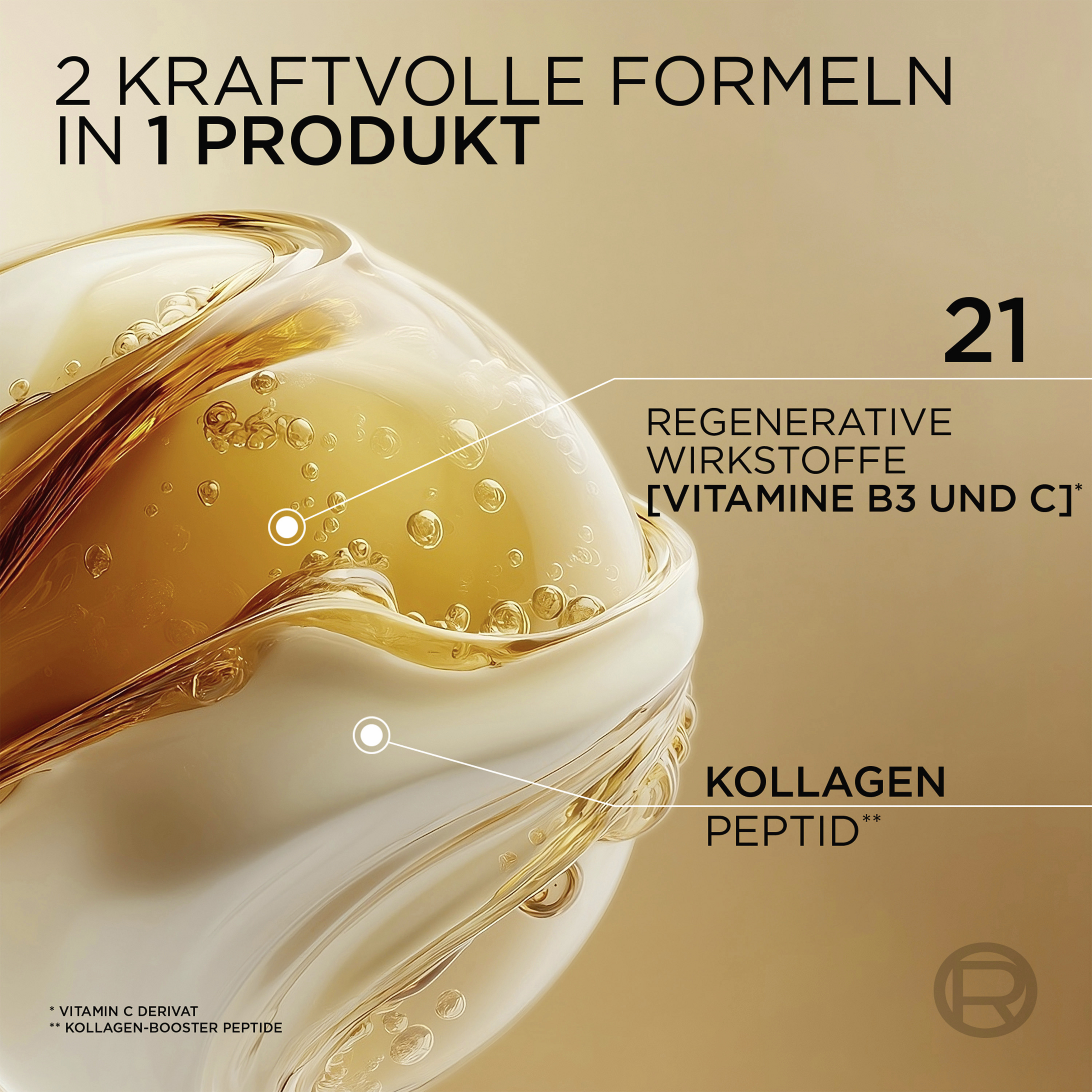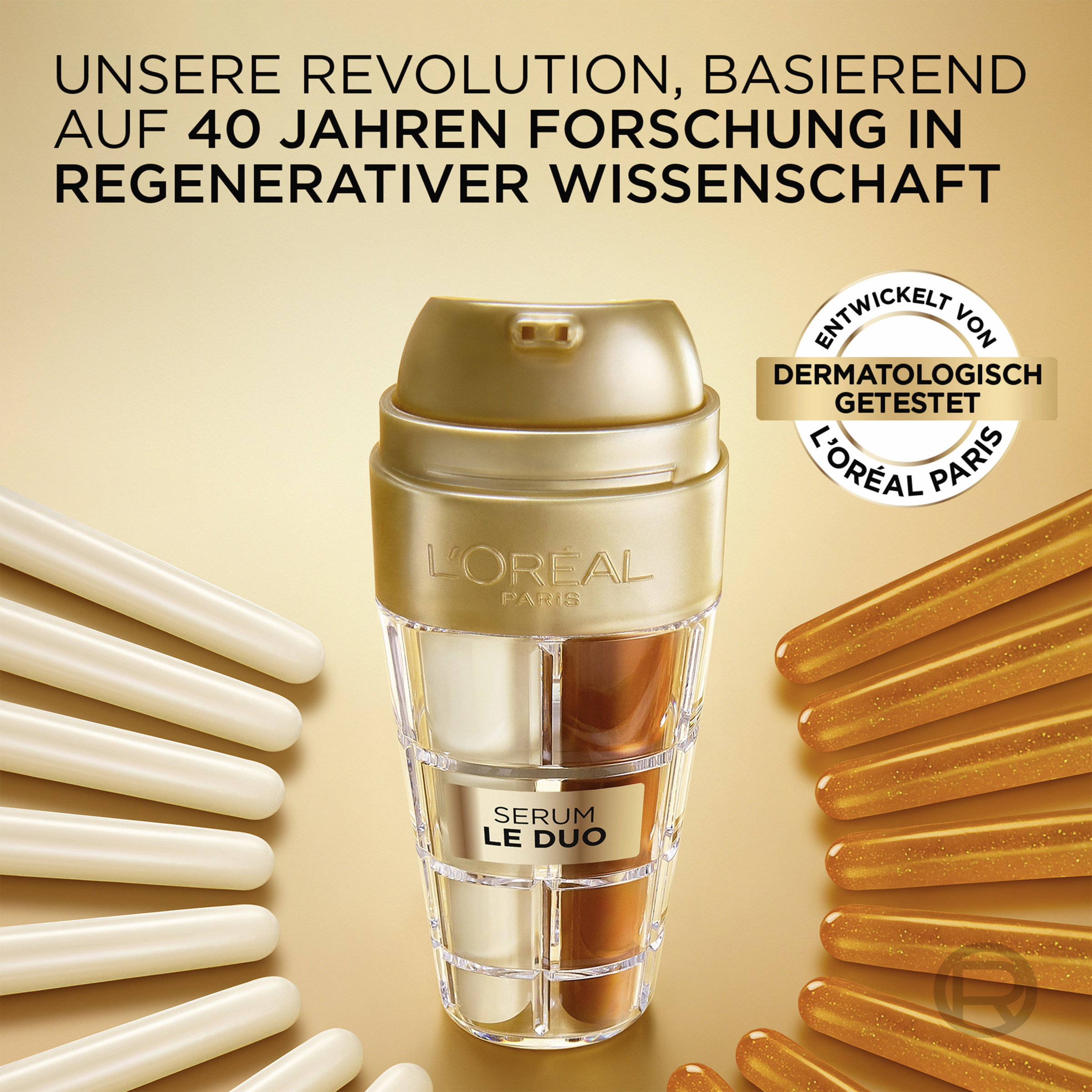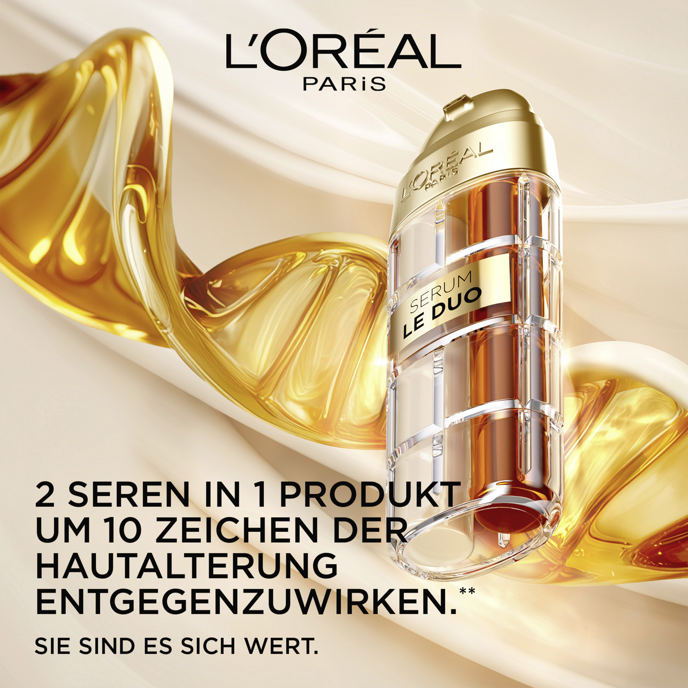 Das L’Oréal Paris Age Perfect Le Duo Serum ist ein intensiv pflegendes Serum, das die hohe Wirksamkeit zweier Seren in einem vereint. Die Haut wird sofort revitalisiert. Dank enthaltenen Kollagen Peptid kann die Hautstruktur gekräftigt und Falten gemildert werden. Zudem sind Vitamin B3 und CG wertvolle Inhaltsstoffe, um die Strahlkraft der Haut von innen heraus zu fördern. Das 2-in-1 Serum verjüngt die Haut sichtbar und trägt zu einem glatteren, gepflegteren Erscheinungsbild bei. Bereits nach einer Anwendung von 7 Tagen wirkt der Teint straffer und aufgepolstert. Nach 4 Wochen ist die Ebenmäßigkeit im Hautton deutlich sichtbar – so wird den Anzeichen der Hautalterung effektiv entgegengewirkt.