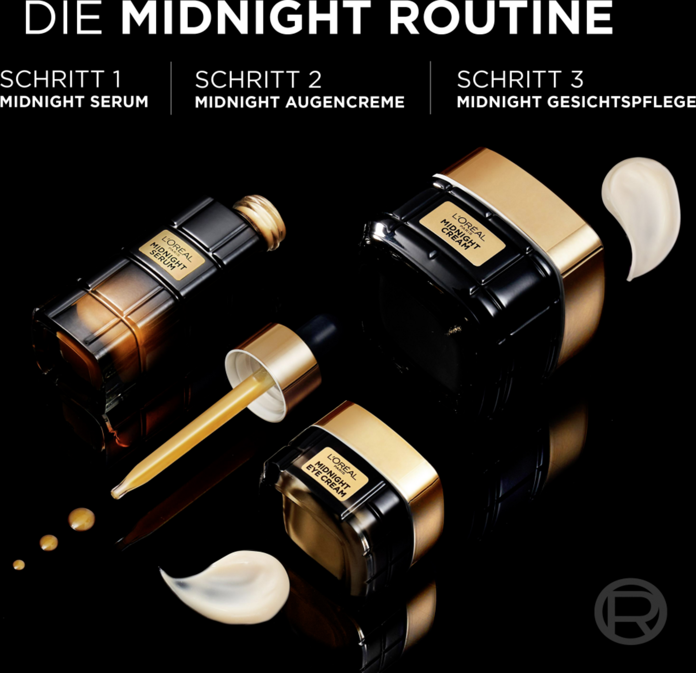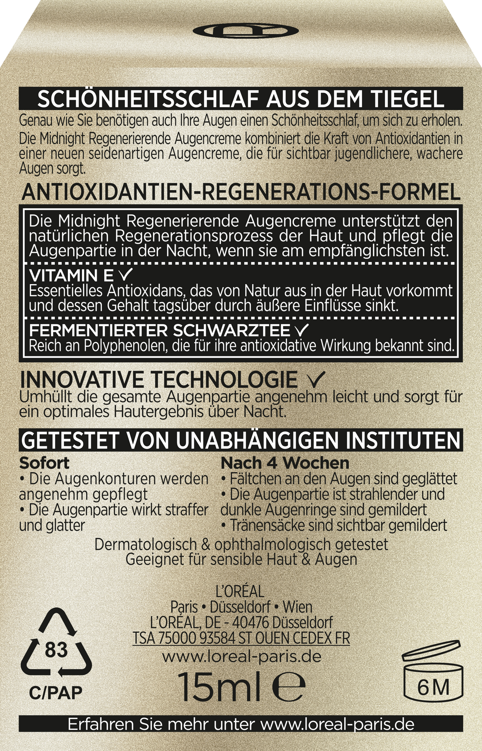 Genau wie Sie benötigen auch Ihre Augen einen Schönheitsschlaf, um sich zu erholen. Die Midnight regenerierende Augencreme kombiniert die Kraft von Antioxidantien in einer neuen seidenartigen Augencreme, die für sichtbar jugendlichere, wachere Augen sorgt. Die Creme mit Antioxidantien-Regenerations-Formel unterstützt den natürlichen Regenerationsprozess der Haut und pflegt die Augenpartie in der Nacht, wenn sie am empfänglichsten ist. Die Formel enthält Vitamin E, das von Natur aus in der Haut vorkommt und dessen Gehalt tagsüber durch äußere Einflüsse sinkt, sowie fermentierten Schwarztee, der für eine antioxidative Wirkung bekannt ist.