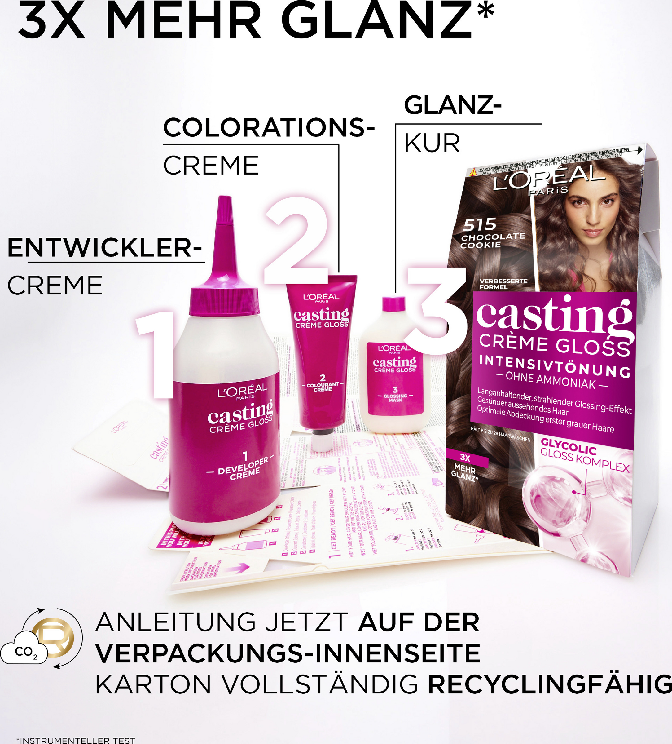 Auftragen: Die Colorations-Creme in die Entwickler-Milch geben und die Flasche kräftig schütteln. Die angemischte Tönung Strähne für Strähne auf das feuchte, ungewaschene Haar auftragen. Nach ca. 20 Minuten Einwirkzeit gründlich ausspülen und den Glanz-Reflex-Balsam einarbeiten. Nach 2 Minuten ausspülen.