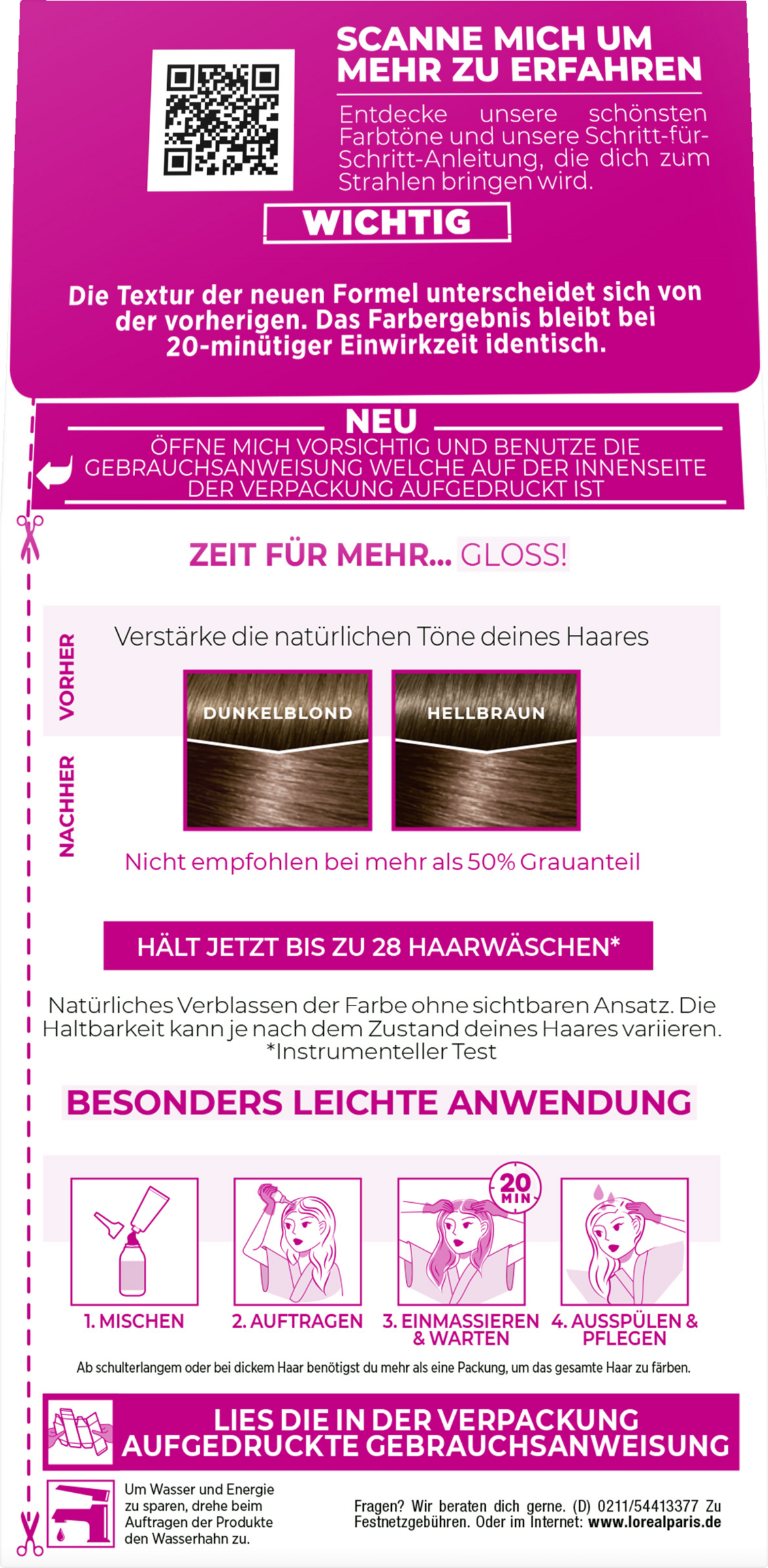 HAARFÄRBEMITTEL KÖNNEN SCHWERE ALLERGISCHE REAKTIONEN HERVORRUFEN. Bitte folgende Hinweise lesen und beachten: Dieses Produkt ist nicht für Personen unter 16 Jahren bestimmt. TEMPORÄRE TÄTOWIERUNGEN MIT „SCHWARZEM HENNA“ KÖNNEN DAS ALLERGIERISIKO ERHÖHEN. Färben Sie Ihr Haar nicht: • wenn Sie einen Ausschlag im Gesicht haben oder wenn Ihre Kopfhaut empfindlich, gereizt oder verletzt ist. • wenn Sie schon einmal nach dem Färben Ihres Haares eine Reaktion festgestellt haben. • wenn eine temporäre Tätowierung mit „schwarzem Henna“ bei Ihnen schon einmal eine Reaktion verursacht hat. DAS NICHTBEACHTEN EINER VORLIEGENDEN ALLERGIE KANN LEBENSBEDROHLICH SEIN. Es ist unbedingt erforderlich, einen ALLERGIEVERDACHTSTEST 48 STUNDEN VOR jeder Anwendung des Produkts durchzuführen, auch wenn Sie Haarfarben bereits früher verwendet haben. Denken Sie deshalb daran, das Produkt 48 Stunden vorher zu kaufen. (Gebrauchsanweisung beachten). Bei einer Reaktion oder falls Sie Fragen zur persönlichen Verträglichkeit haben, wenden Sie sich vor Anwendung einer Haarfarbe an einen Arzt. “Entwickler” enthält Wasserstoffperoxid. “Colorationsprodukt” enthält: Phenylendiamin, Resorcin, Phenylendiamine (Toluylendiamine), Ammoniak. • Geeignete Handschuhe tragen. Diese liegen der Packung bei. • Kontakt mit den Augen vermeiden. Nicht zur Färbung von Wimpern und Augenbrauen verwenden. • Sofort Augen spülen, falls das Erzeugnis mit den Augen in Berührung gekommen ist. • Nach Anwendung die Haare gut spülen. Dieses Produkt frühestens 15 Tage nach einer Entkräuselung, Dauerwelle oder einer langanhaltenden Glättung anwenden. Nicht anwenden, wenn Ihre Haare mit Henna gefärbt oder mit einem Produkt behandelt wurden, das schrittweise zur natürlichen Haarfarbe zurückführt. Darf nicht in die Hände von Kindern gelangen. GEBRAUCHSANWEISUNG BEFOLGEN Inhaltsstoffe auf der Unterseite der Packung. Außer Reichweite von Kindern aufbewahren. Nur zur Benutzung durch Erwachsene.