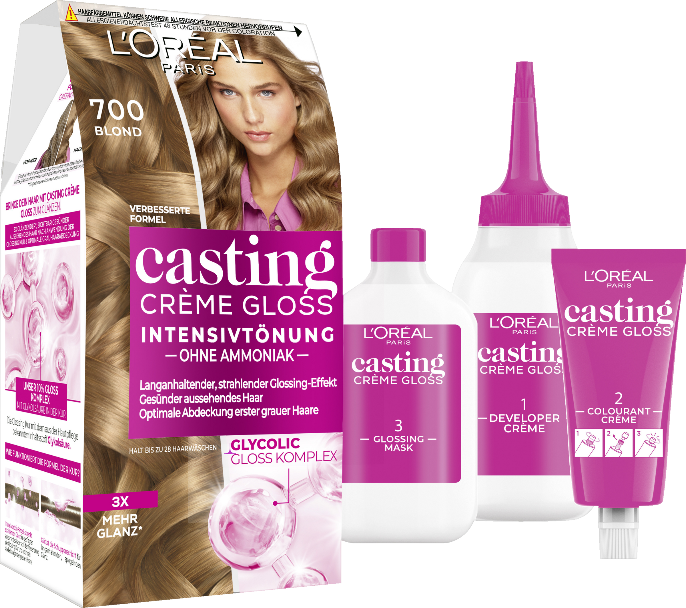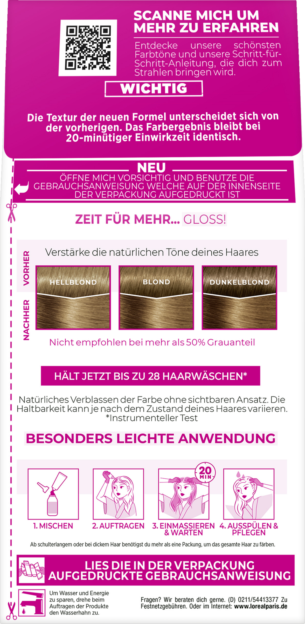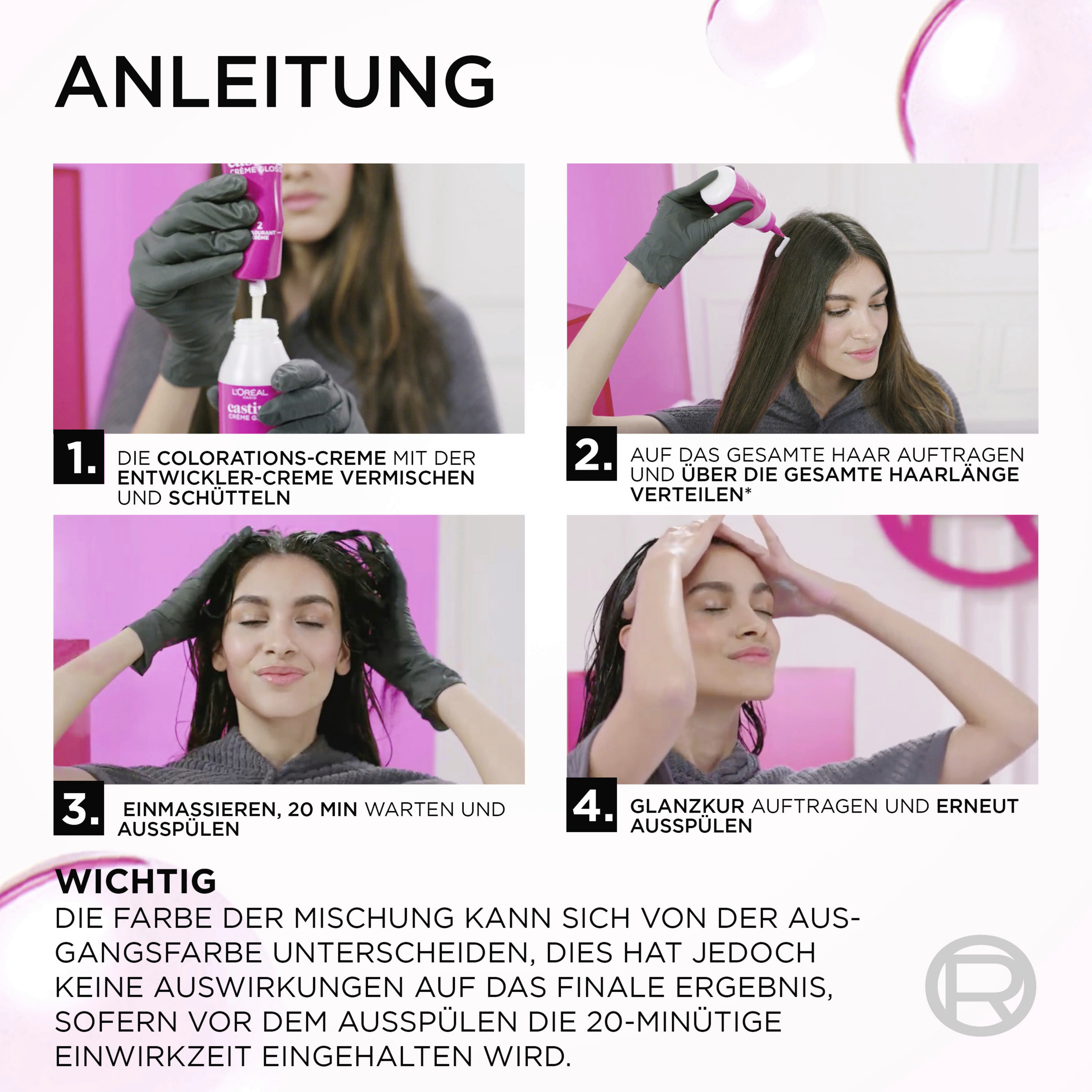 Inhalt: 1x Tube Colorations-Creme 48ml, 1x Tube Entwickler-Creme 72ml, 1x Glossing-Kur 60ml, 1x Paar Einmalhandschuhe, 1x Gebrauchsanweisung