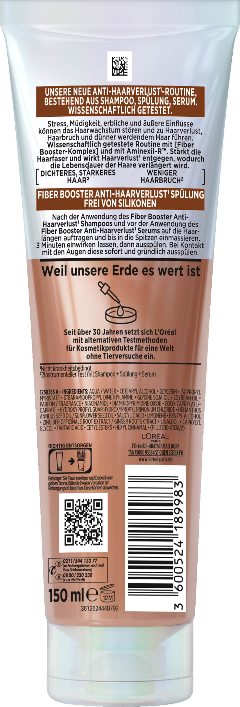 Die Fiber Booster Anti-Haarverlust von L’Oréal Paris unterstützt das Haar bei den unterschiedlichen Ursachen von Haarverlust und Haarbruch. Die Elvital Fiber Booster Spülung ist Bestandteil der 3-teiligen Fiber Booster Anti-Haarverlust Routine für volleres & stärkeres Haar. Die Routine ist wissenschaftlich getestet und wird durch den innovativen Fiber Booster-Wirkstoffkomplex mit Aminexil-R unterstützt. Die hochwirksamen Inhaltsstoffe Aminexil, Gingerol und Niacinamid stärken die Haarfaser, hilft Haarverlust zu reduzieren und letztlich den Lebenszyklus der Haare zu verlängern.