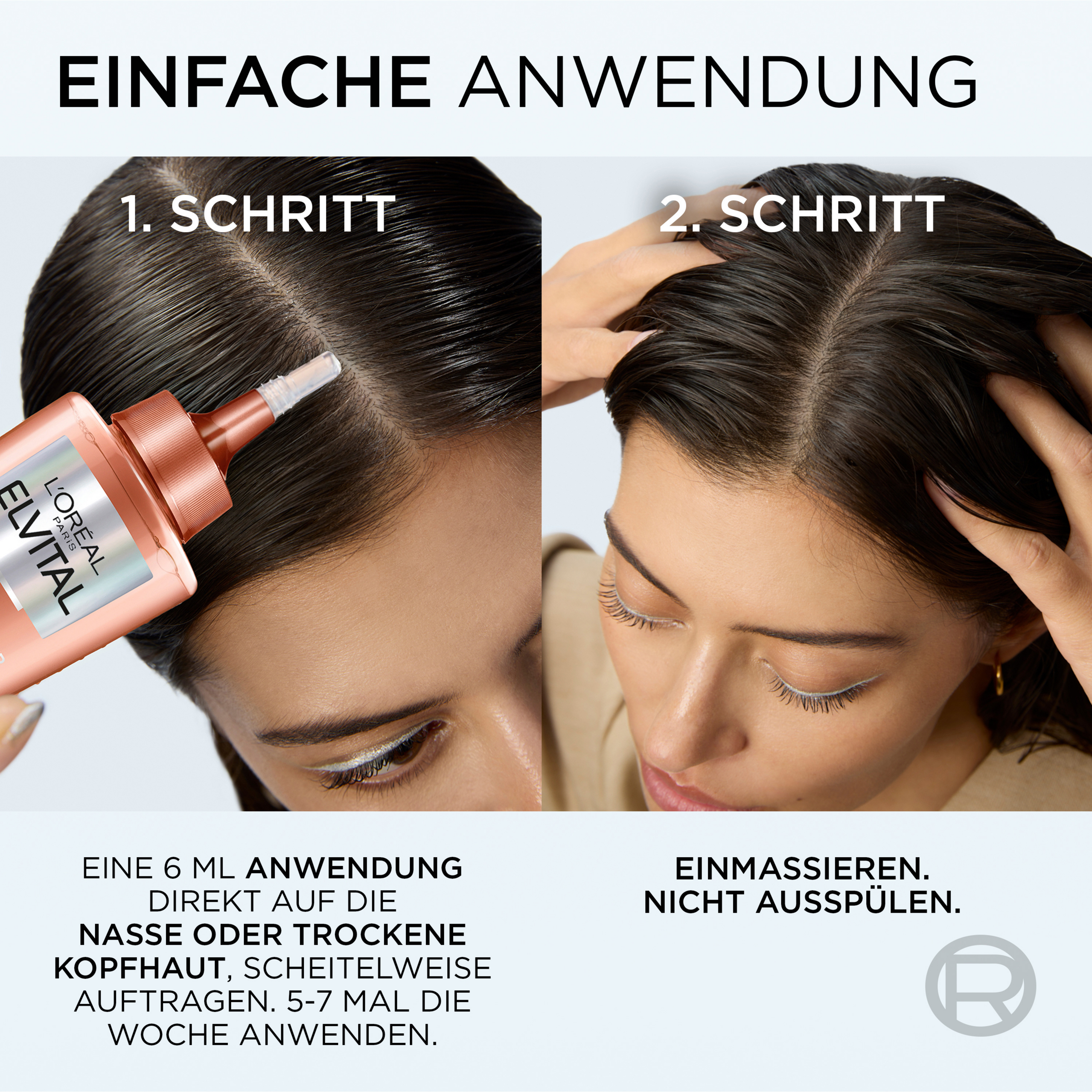 Das Elvital Fiber Booster Anti-Haarverlust Serum 5 bis 7 Mal pro Woche mithilfe des feinen Applikators direkt auf die Kopfhaut auftragen und mit den Fingern und kreisenden Bewegungen sanft in die Kopfhaut einmassieren – ohne es abschließend auszuspülen. Bei Kontakt mit den Augen sofort und gründlich ausspülen. Das Fiber Booster Serum ist der dritte und letzte Schritt der 3-teiligen Fiber Booster Anti-Haarverlust Routine und wird nach dem Shampoo und der Spülung angewendet.