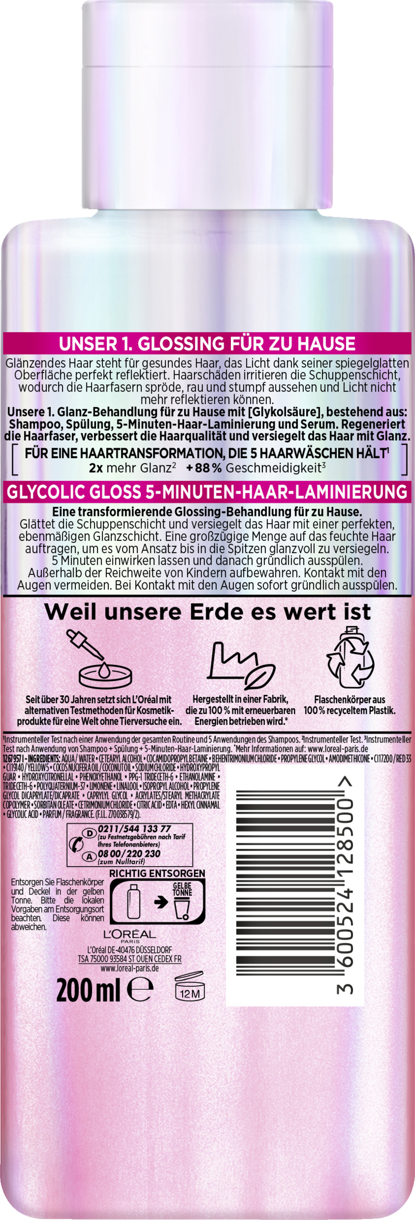 Die 1. Glanzbehandlung für zu Hause mit [Glykolsäure], bestehend aus: Shampoo, Spülung, 5-Minuten-Haar-Laminierung und Serum. Regeniert die Haarfaser, verbessert die Haarqualität und versiegelt das Haar mit Glanz.