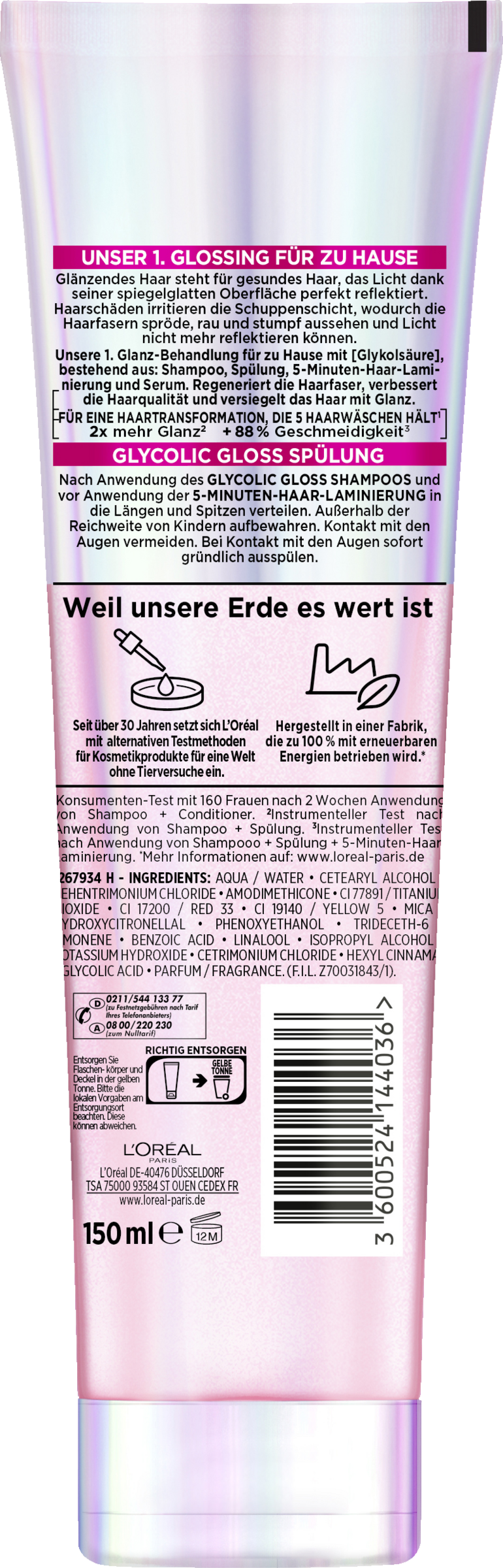 Die 1. Glanz Behandlung für zu Hause mit [Glykolsäure], bestehend aus: Shampoo, Spülung, 5-Minuten-Haar-Laminierung und Serum. Regeneriert die Haarfaser, verbessert die Haarqualität und versiegelt das Haar mit Glanz.