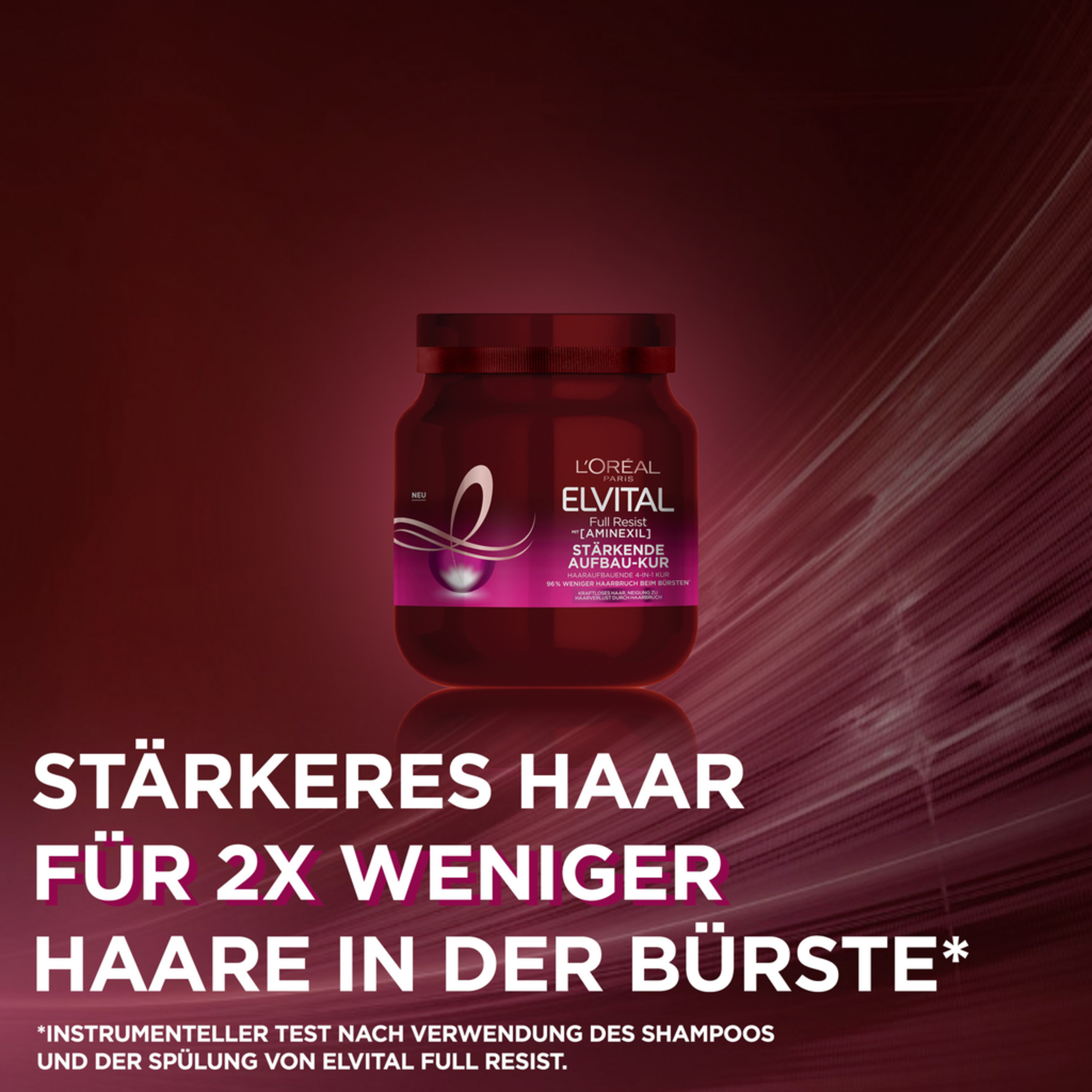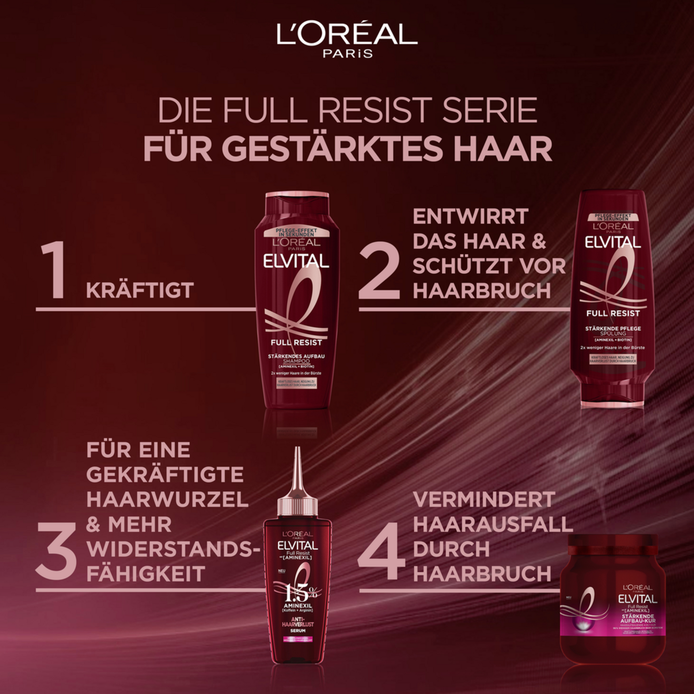 Gib deinem Haar Stärke zurück! Die stärkende Aufbau-Kur von Elvital Full Resist sorgt für weniger Haarbruch beim Bürsten und durch ihre federleichte, gelartige Textur täglich als Rinse-Out oder Leave-In auf der Kopfhaut und in den Haarlängen anwendbar. Die Formel mit Aminexil, Biotin und Arginin eignet sich besonders gut für kraftloses Haar mit einer Neigung zu Haarverlust durch Haarbruch.