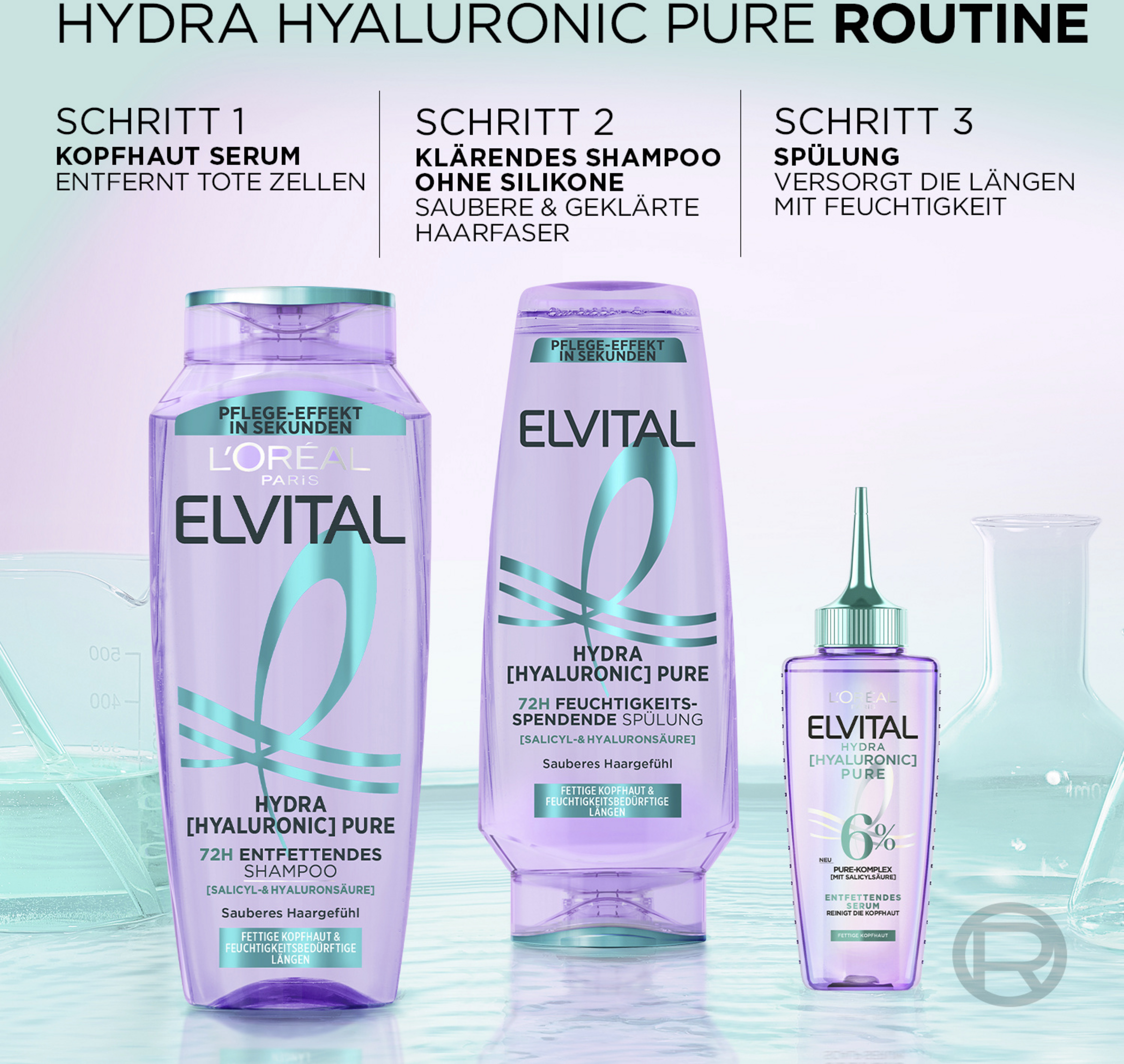 Nach dem das Hydra [Hyaluronic] Pure Serum auf das nasse Haar aufgetragen wurde, das Shampoo sanft in die Kopfhaut einmassieren und ausspülen.