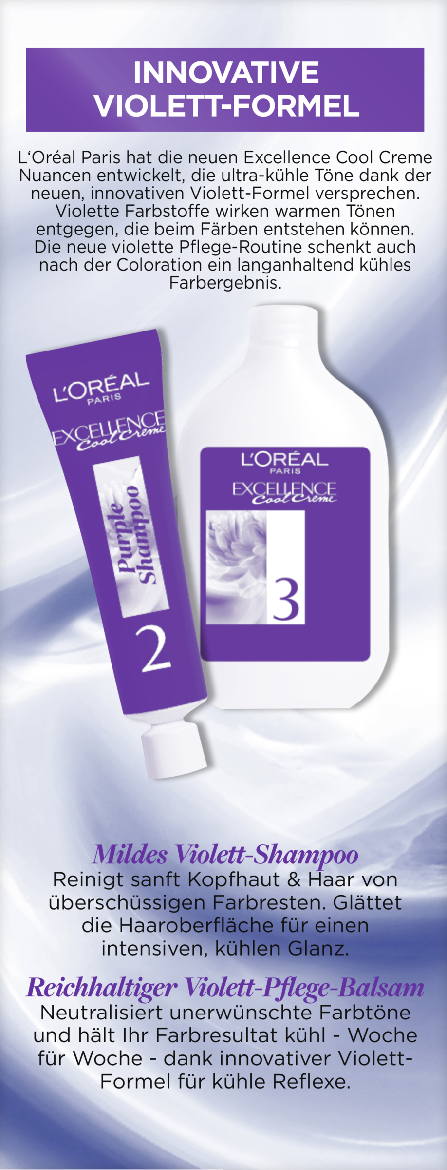 L'Oréal Paris hat die neuen Excellence Cool Creme Nuancen entwickelt, die ultra-kühle Töne dank der innovativen Violett-Formel versprechen. Violette Farbstoffe wirken warmen Tönen entgegen, die beim Färben entstehen können. Die neue violette Pflege-Routine schenkt auch nach der Coloration ein langanhaltend kühles Farbergebnis.