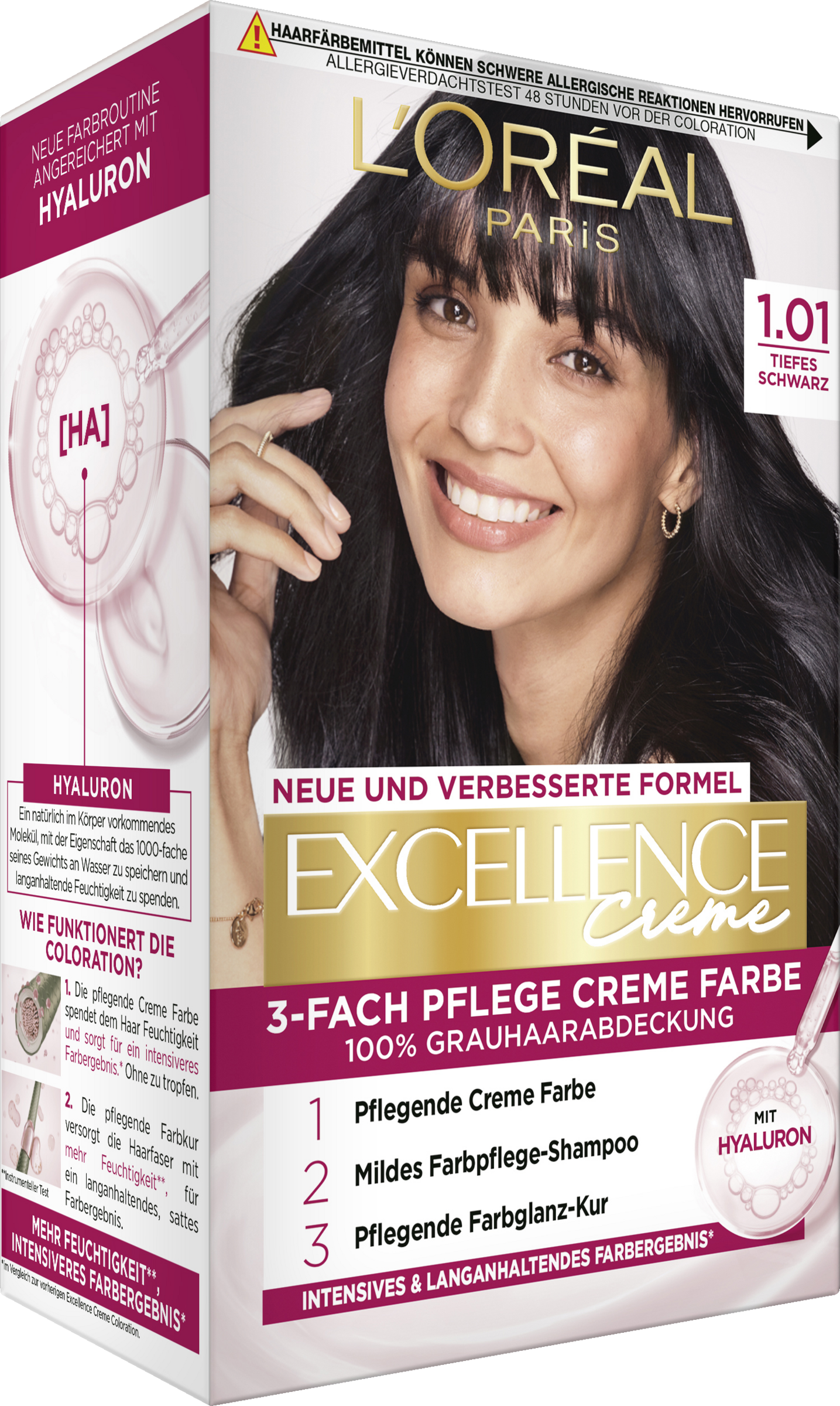 L'Oréal Paris Excellence 1.01 Tiefes Schwarz ist eine 3-fach Pflege Creme Farbe angereichert mit Tiefenschutzserum, Pro-Keratin und Aufbau-Ceramid für kräftiges, geschütztes Haar und eine langanhaltende glänzende Farbe. Jetzt neu: mit Farbpflege-Shampoo!