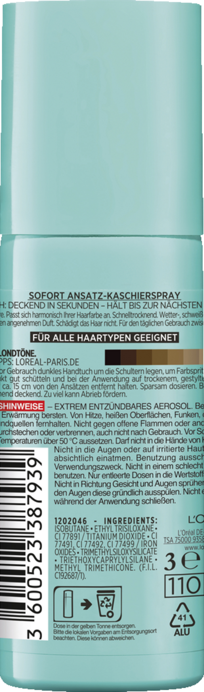 L'Oreal Paris Magic Retouch Ansatz-Kaschierspray Hellblond eignet sich für hellblondes Haar und kaschiert selbst graue Haaransätze in nur 3 Sekunden. Der Mix aus facettenreichen Pigmenten passt sich harmonisch den Längen der Haare an – für stufenlose Übergänge! Mit diesem handlichen Helfer sind spontane wichtige Verabredungen kein Problem. Einfach Dose kurz schütteln, sprühen und der Haaransatz ist kaschiert.Die Farbe hält zuverlässig bis zur nächsten Haarwäsche – und auch Schweiß, feuchtes Wetter oder Styling können ihr nichts anhaben. Das Ansatzspray können Sie auf allen Haarfarben und Colorationsmarken anwenden, sogar auf Salonfarben.