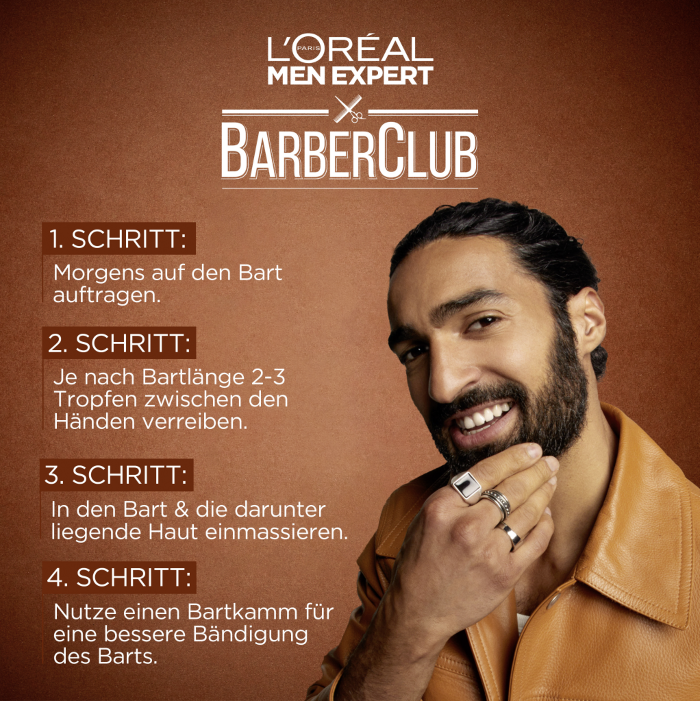 Vor der Anwendung gründlich Gesicht und Bart waschen. 2 bis 3 Tropfen des Barber Club Bartöls Haut und Bart von L'Oréal Paris Men Expert in den Handflächen verreiben und auf den Bart auftragen. Anschließend das Bartpflegeöl mit den Fingerspitzen in die Gesichtshaut einmassieren und mit den Fingern oder einem Bartkamm bis in die Bartspitzen verteilen. Durch sanftes Kneten kann die L'Oréal Paris Men Expert Bartpflege noch besser in den Bart einziehen. Augenkontakt vermeiden und bei Kontakt sofort mit viel klarem Wasser ausspülen. Das Bartöl fettet nicht und kann daher morgens aufgetragen werden, ohne dass Bedenken wegen der Bekleidung notwendig sind.