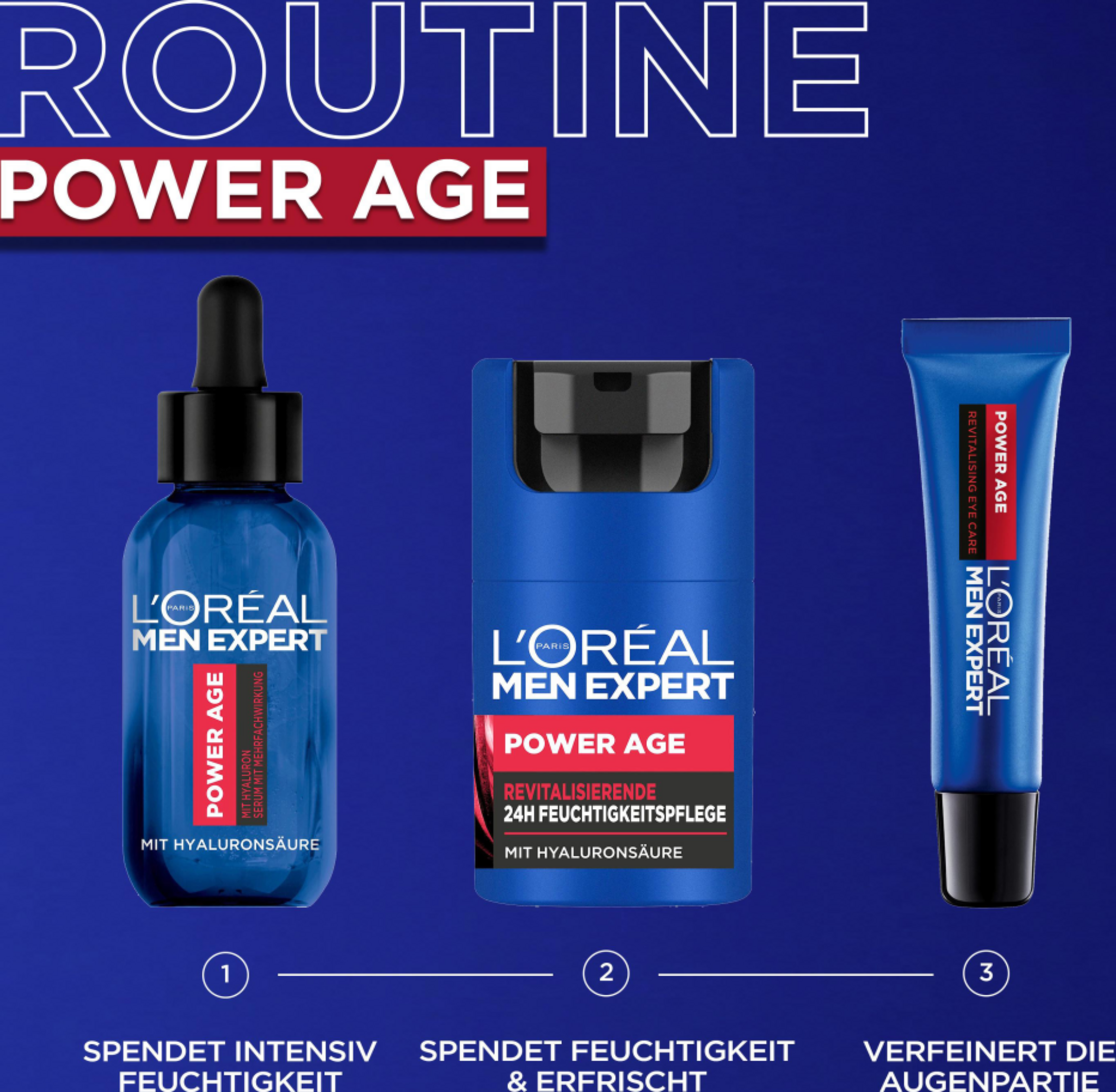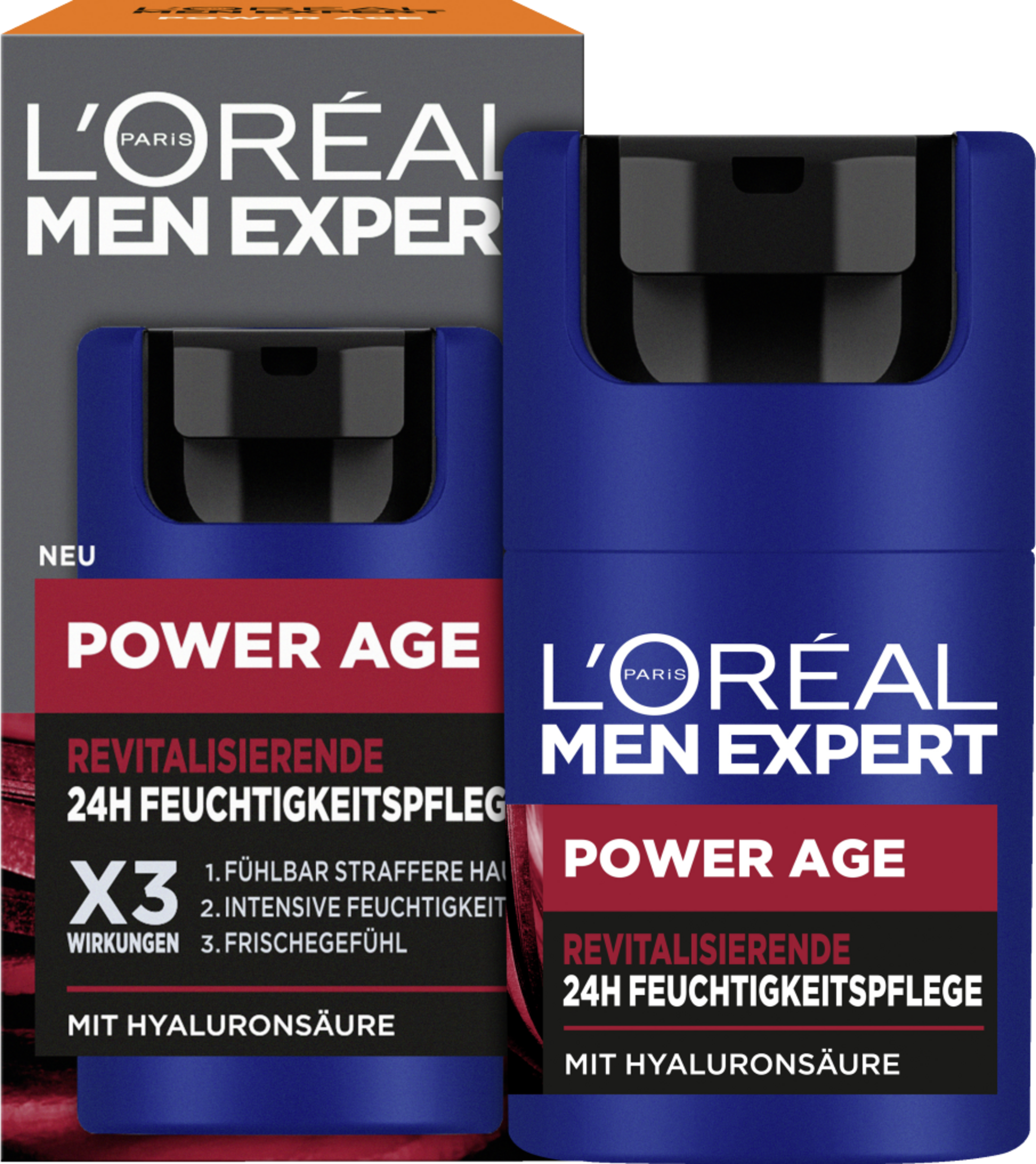 Das perfekte Duo für trockene Männerhaut mit ersten Alterserscheinungen: entdecke die Power Age revitalisierende 24H Feuchtigkeitspflege & das Power Age Serum mit Hyaluronsäure für Männer. Die Feuchtigkeitspflege bietet fühlbar straffere Haut, frischere und revitalisierte Haut, sowie ein glatteres Hautbild. Sie zieht schnell ein und ist unsichtbar auf der Haut. Die Formel enthält Hyaluronsäure, welche bekannt ist für eine besonders feuchtigkeitsspendende Eigenschaft und sorgt so für ein frisches Hautgefühl. Das Power Age Serum glättet, strafft und revitalisiert das Erscheinungsbild der Haut. Hilft die sichtbaren Zeichen der Hautalterung zu mildern und die Haut gesund aussehen zu lassen.