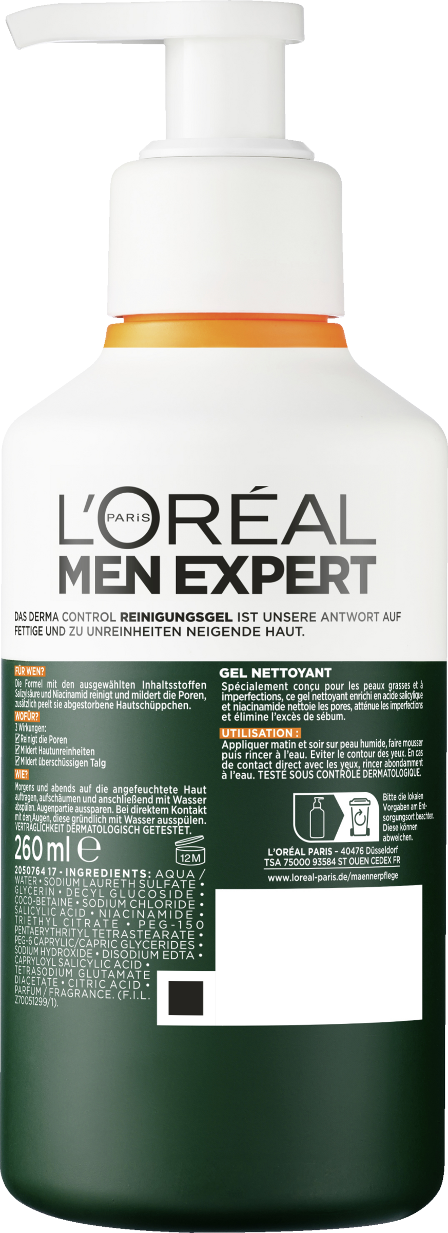 Das L’Oréal Men Expert Derma Control Reinigungsgel ist eine Gesichtsreinigung für Männer von etwa 18 bis 24 Jahren. Die Formel mit Salizylsäure und Niacinamid reinigt sanft und wirksam die Poren und mildert gleichzeitig zukünftige Unreinheiten. Dabei eignet es sich nicht nur zur Behandlung aller Formen von Akne, Hautunreinheiten und Pickeln, sondern kann auch optimal zur Vorbeugung zukünftiger Akne-Ausbrüche angewandt werden. Zudem ist die Gesichtsreinigung Teil der 4-Schritte Derma Control-Hautpflegeroutine bei zu Unreinheiten neigender und öliger Haut.