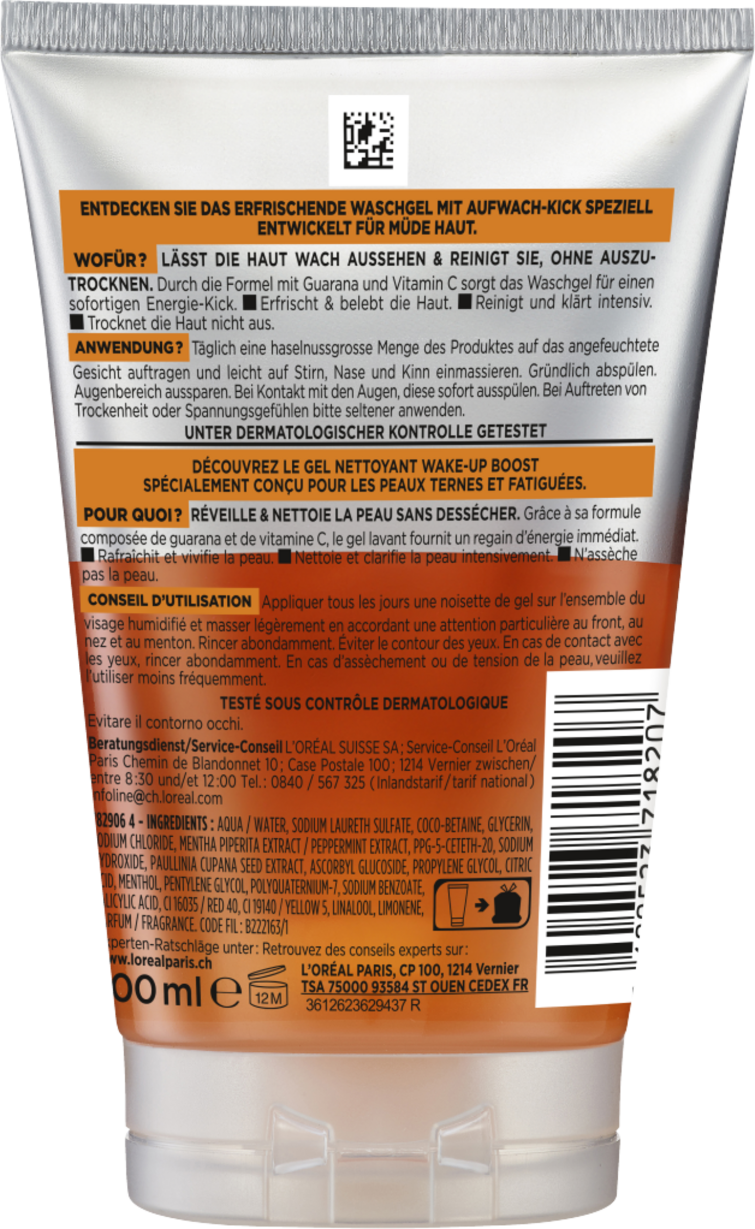 Aqua / Water, Sodium Laurethsulfate, Coco-Betaine, Glycerin, Sodium Chloride, Menthapiperita Extract / Peppermint Extract, Ppg-5-Ceteth-20, Sodium Hydroxide, Paullinia Cupana Seed Extract, Ascorbyl Glucoside, Propylene Glycol, Citric Acid, Menthol, Pentylene Glycol, Polyquaternium-7, Sodiumbenzoate, Salicylic Acid, Ci 16035 / Red 40, Ci 19140 / Yellow5, Linalool, Limonene, Parfum / Fragrance (F.I.L. B222163/1)