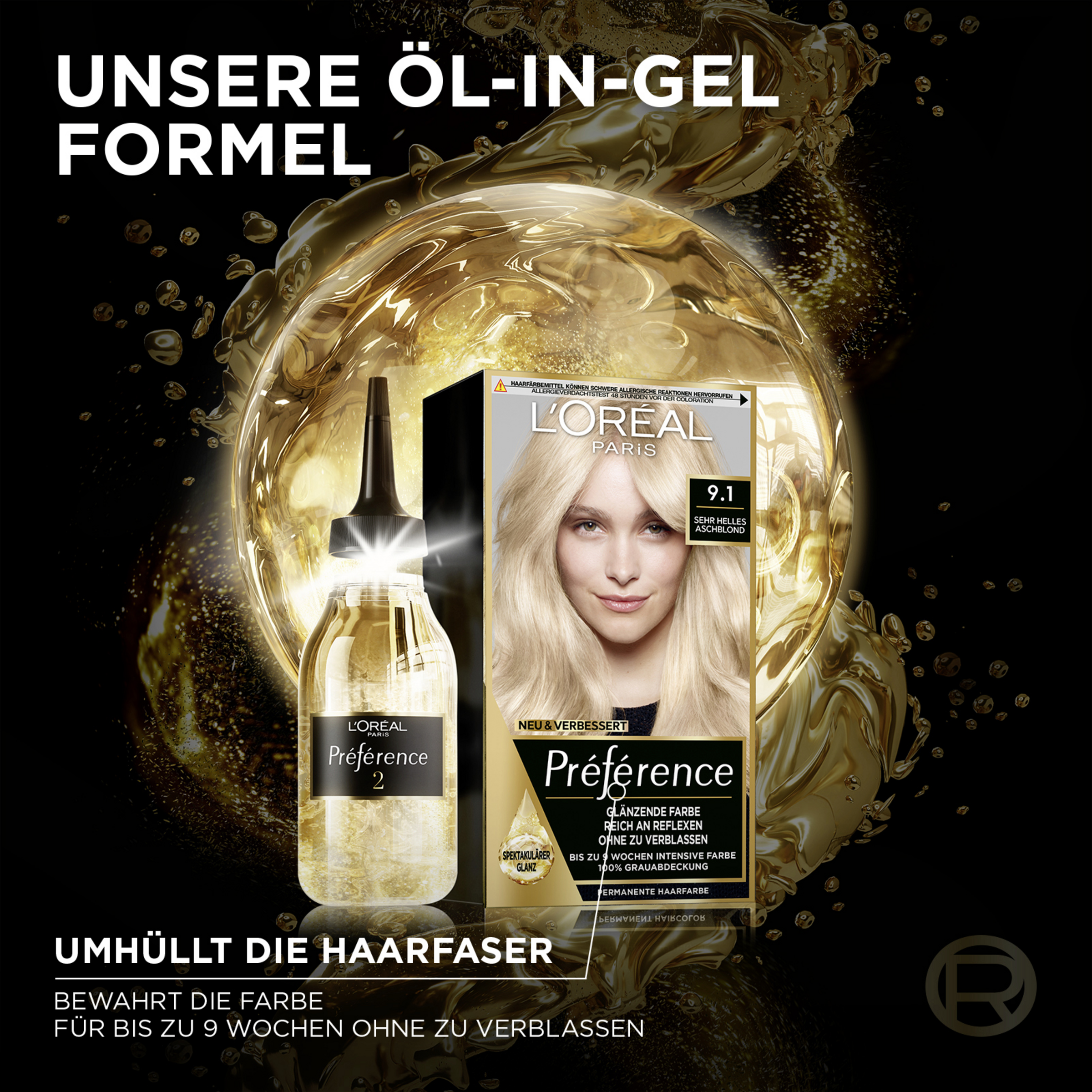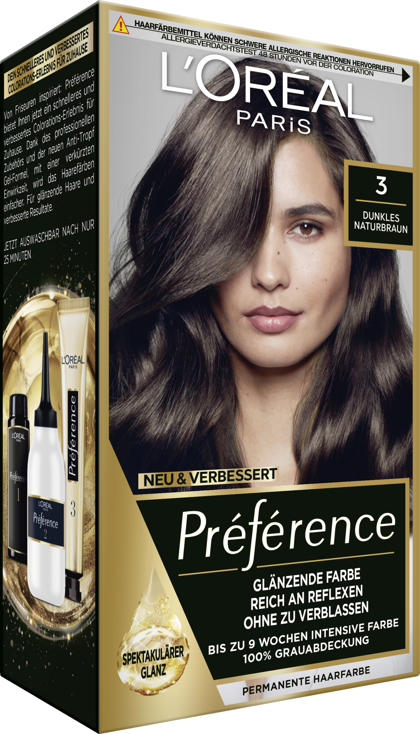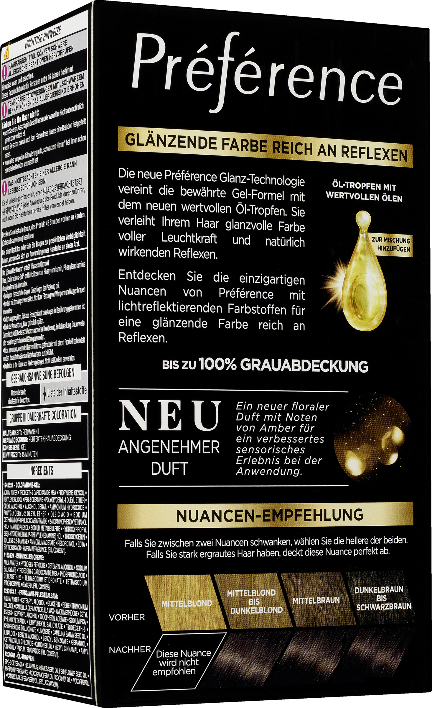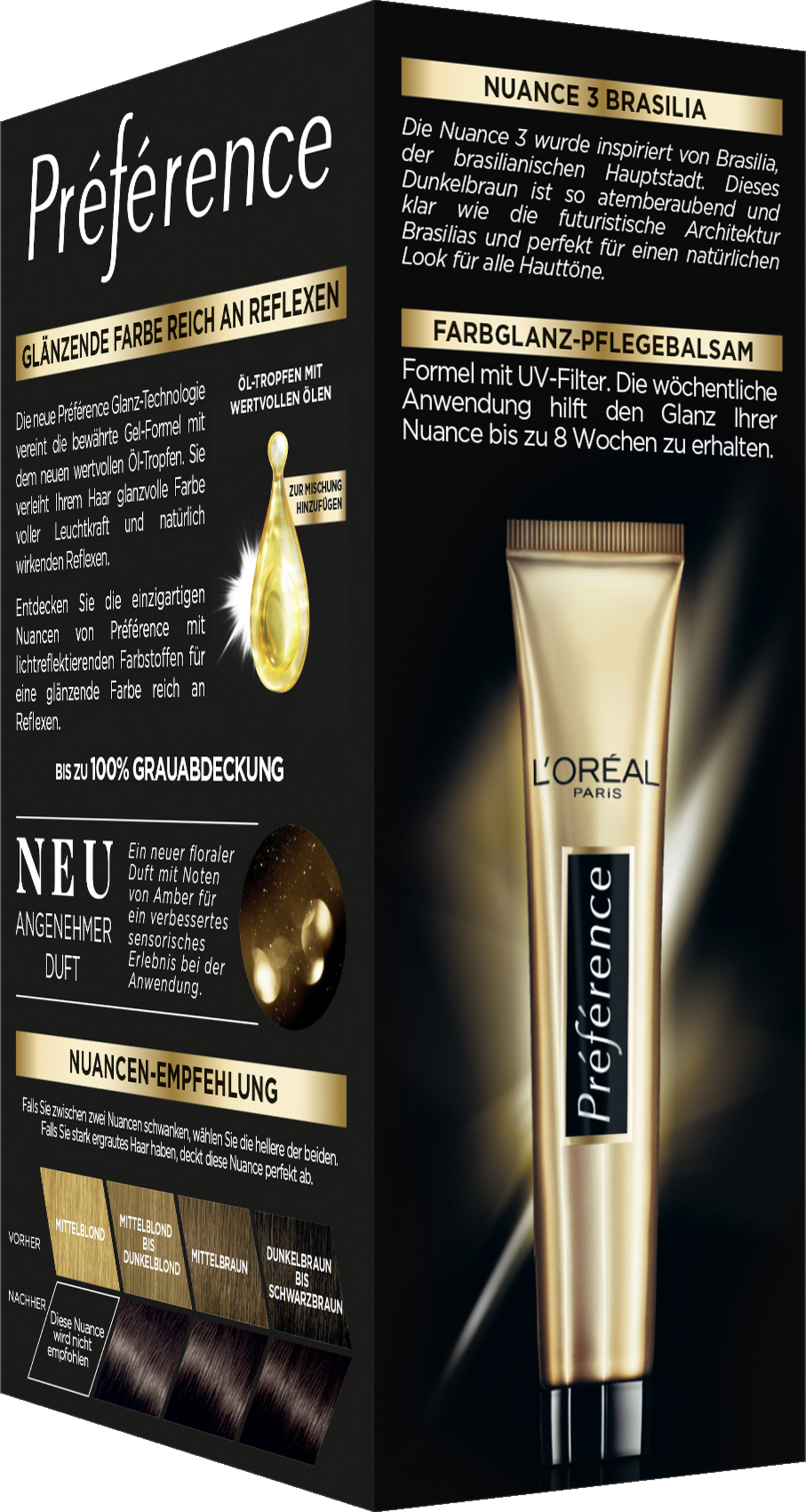 Die neue Préférence Glanz-Technologie vereint die bewährte GelFormel mit dem neuen wertvollen Öl-Tropfen. Sie verleiht Ihrem Haar glanzvolle Farbe voller Leuchtkraft und natürlich wirkenden Reflexen. Entdecken Sie die einzigartigen Nuancen von Préférence mit lichtreflektierenden Farbstoffen für eine glänzende Farbe reich an Reflexen.