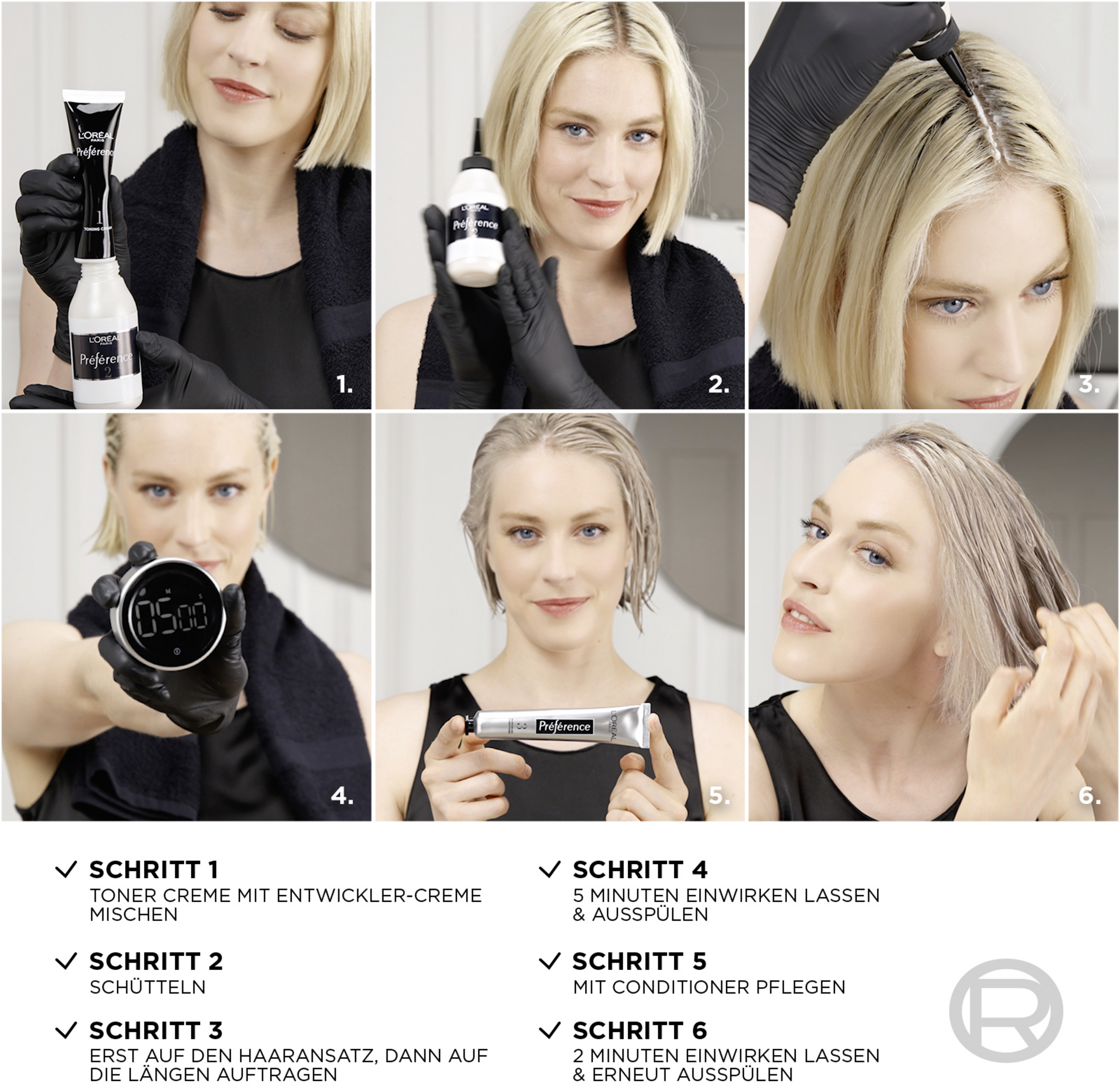 Beinhaltet: 1x Toner Creme 60ml, 1x Entwickler-Creme 60ml, 1x Pflegender Conditioner 45ml, 1x Gebrauchsanweisung, 1x Paar hochwertige Handschuhe